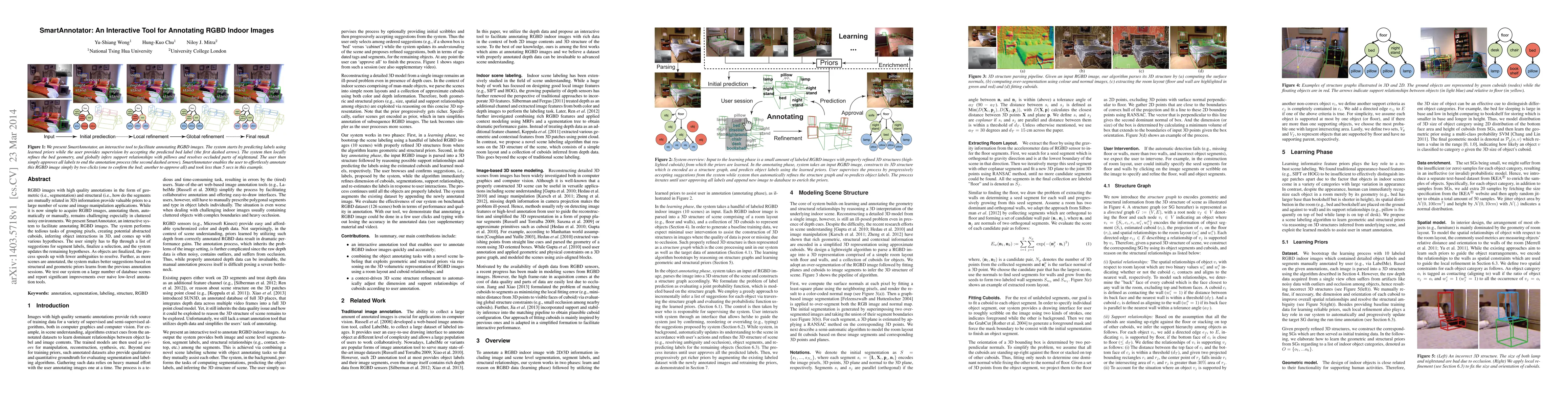 SmartAnnotator is an interactive tool designed to simplify the annotation of RGBD indoor images, automating tasks like pixel grouping and 3D object interaction inference while allowing users to refine suggestions for segment labels. The system improves over time based on learned structural and geometric priors from previous annotations.