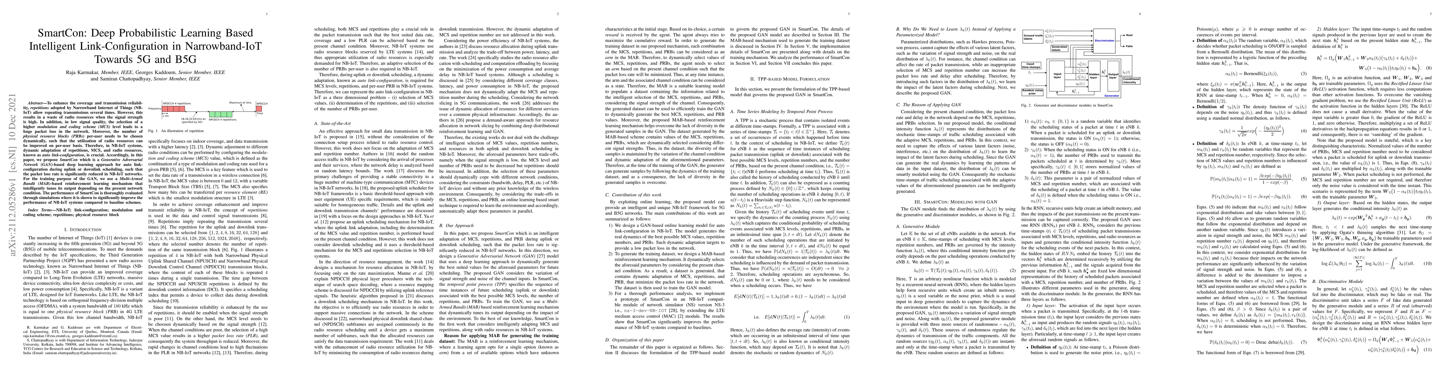 SmartCon proposes a Generative Adversarial Network (GAN)-based deep learning approach for intelligent auto link-configuration in Narrowband Internet of Things (NB-IoT) to enhance coverage and transmission reliability, significantly reducing packet loss through dynamic adaptation of repetitions, modulation, coding schemes, and radio resources. The GAN is trained using a Multi-Armed Bandit-based reinforcement learning mechanism to optimize network performance based on real-time conditions.