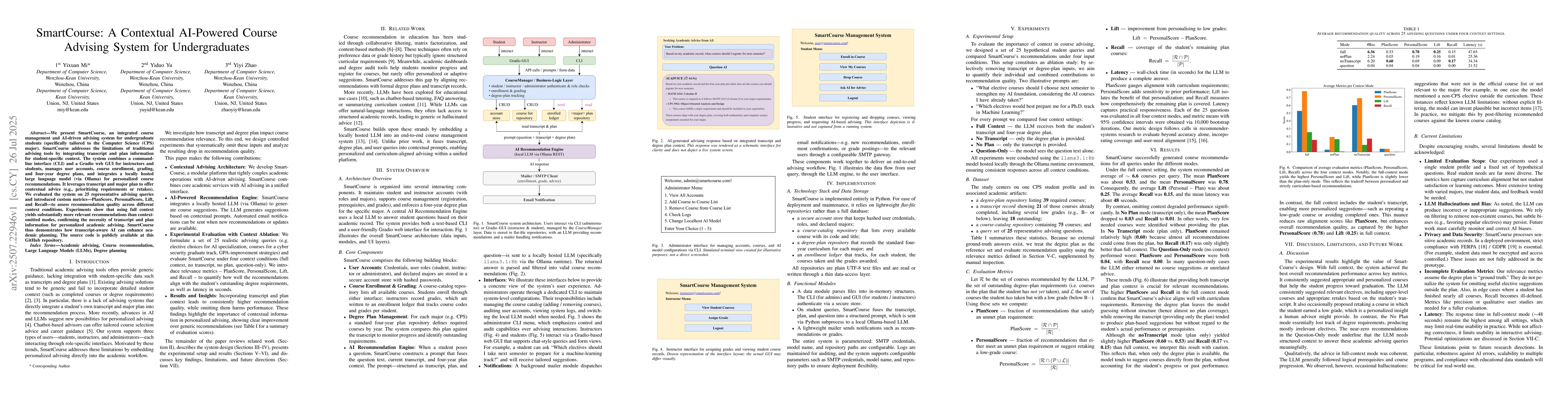 We present SmartCourse, an integrated course management and AI-driven advising system for undergraduate students (specifically tailored to the Computer Science (CPS) major). SmartCourse addresses the limitations of traditional advising tools by integrating transcript and plan information for student-specific context. The system combines a command-line interface (CLI) and a Gradio web GUI for instructors and students, manages user accounts, course enrollment, grading, and four-year degree plans, and integrates a locally hosted large language model (via Ollama) for personalized course recommendations. It leverages transcript and major plan to offer contextual advice (e.g., prioritizing requirements or retakes). We evaluated the system on 25 representative advising queries and introduced custom metrics: PlanScore, PersonalScore, Lift, and Recall to assess recommendation quality across different context conditions. Experiments show that using full context yields substantially more relevant recommendations than context-omitted modes, confirming the necessity of transcript and plan information for personalized academic advising. SmartCourse thus demonstrates how transcript-aware AI can enhance academic planning.