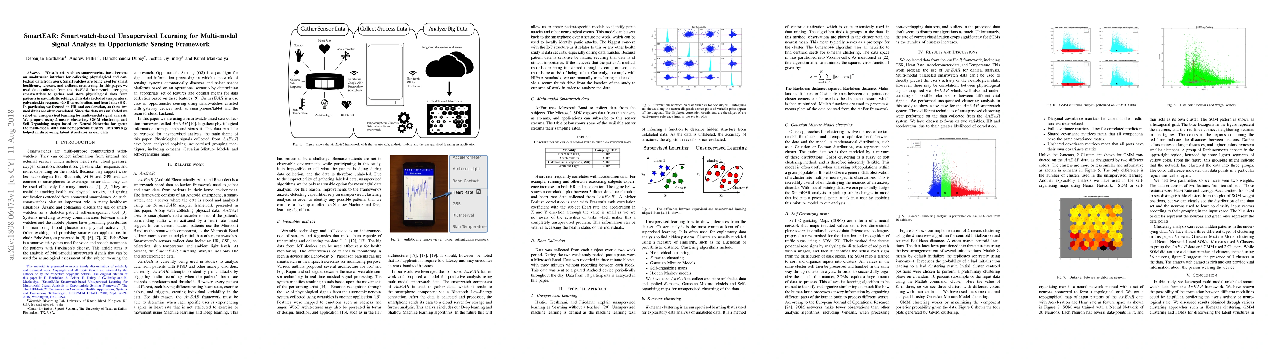 Wrist-bands such as smartwatches have become an unobtrusive interface for collecting physiological and contextual data from users. Smartwatches are being used for smart healthcare, telecare, and wellness monitoring. In this paper, we used data collected from the AnEAR framework leveraging smartwatches to gather and store physiological data from patients in naturalistic settings. This data included temperature, galvanic skin response (GSR), acceleration, and heart rate (HR). In particular, we focused on HR and acceleration, as these two modalities are often correlated. Since the data was unlabeled we relied on unsupervised learning for multi-modal signal analysis. We propose using k-means clustering, GMM clustering, and Self-Organizing maps based on Neural Networks for group the multi-modal data into homogeneous clusters. This strategy helped in discovering latent structures in our data.