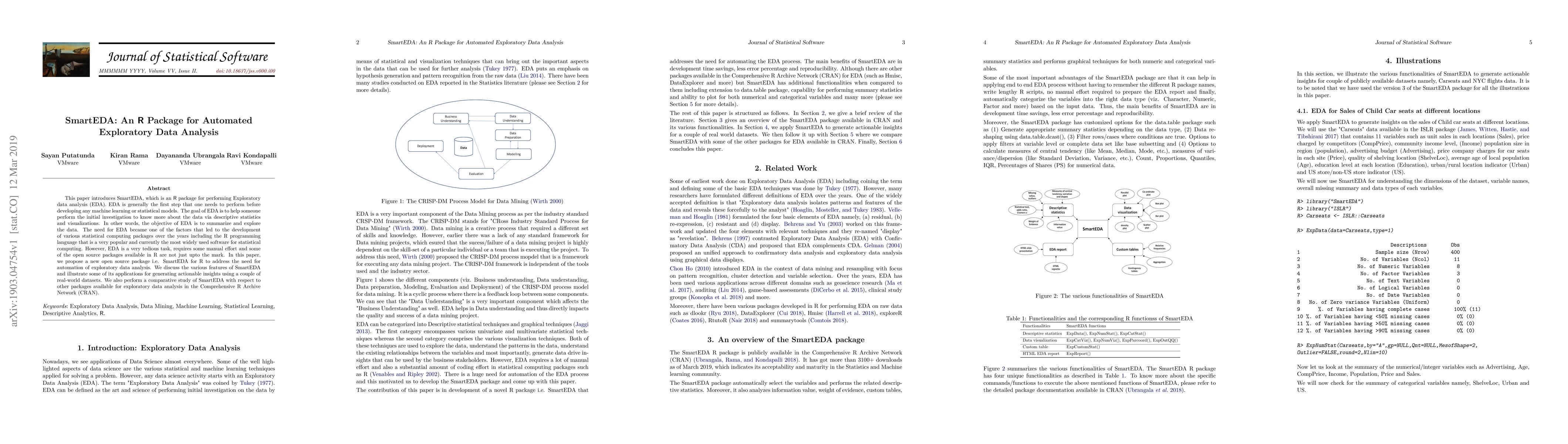 SmartEDA is an R package designed to automate exploratory data analysis (EDA), aiming to simplify the initial investigation phase of data via descriptive statistics and visualizations. The paper discusses its features and compares it with other EDA packages in CRAN, highlighting its potential to generate actionable insights.
