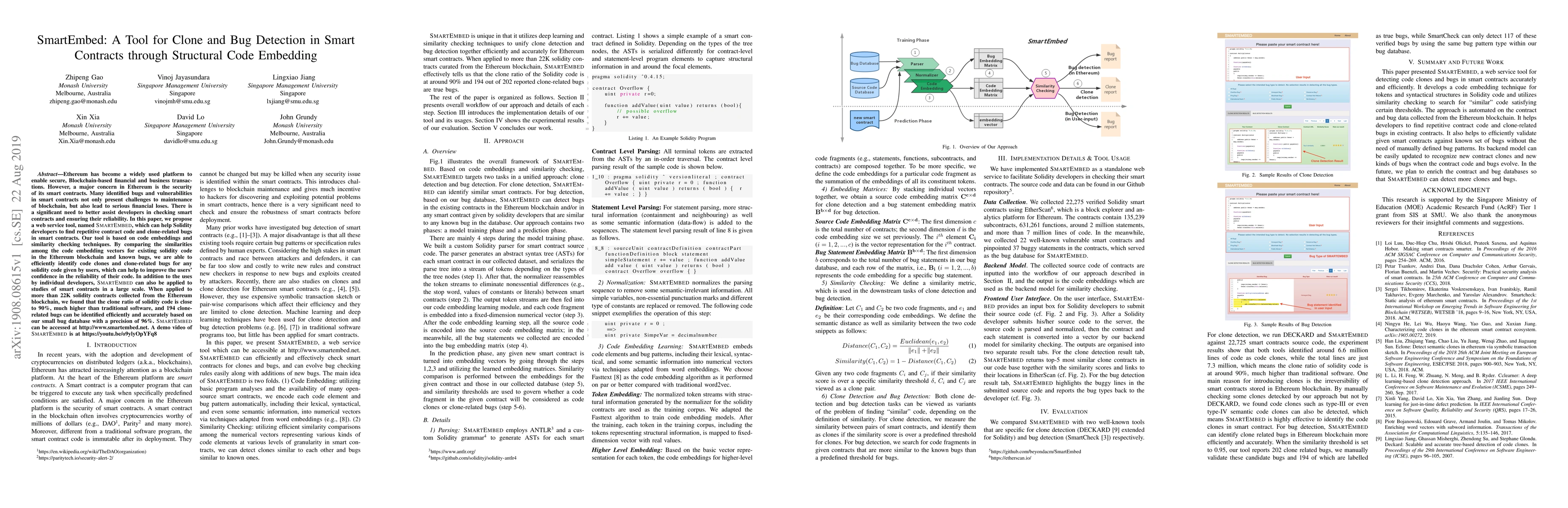 SmartEmbed is a web service tool designed to detect repetitive code and clone-related bugs in Ethereum smart contracts using code embeddings and similarity checking. It efficiently identifies code clones and bugs in Solidity contracts, improving developers' confidence in code reliability, with a clone ratio of nearly 90% and a precision of 96% in detecting bugs.