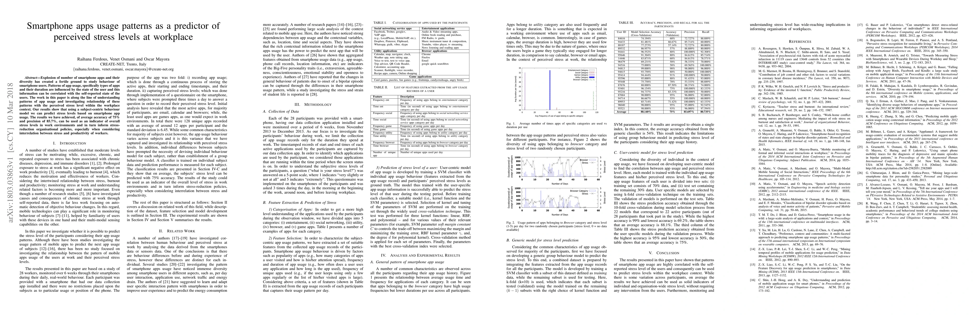 This paper investigates how smartphone app usage patterns correlate with perceived stress levels in workplace settings. Using a subject-centric behaviour model, the study predicts stress levels with an average accuracy of 75% and precision of 85.7%, suggesting potential for informing stress reduction policies.