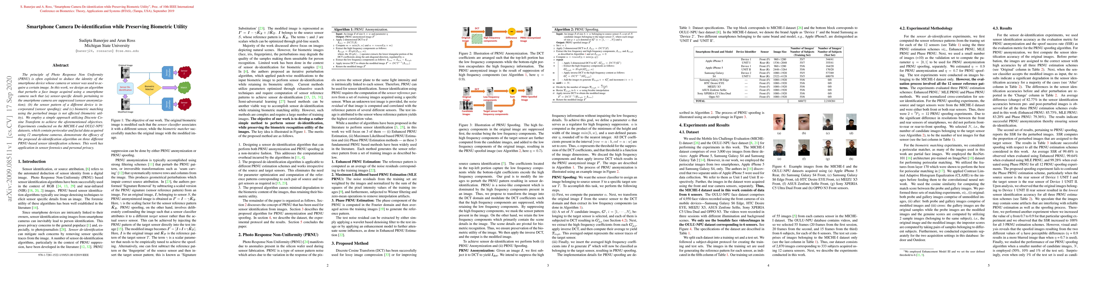 This paper proposes an algorithm to de-identify smartphone camera images by suppressing sensor-specific details while preserving biometric utility, using Discrete Cosine Transform. Experiments on MICHE-I and OULU-NPU datasets show its effectiveness against PRNU-based sensor identification.