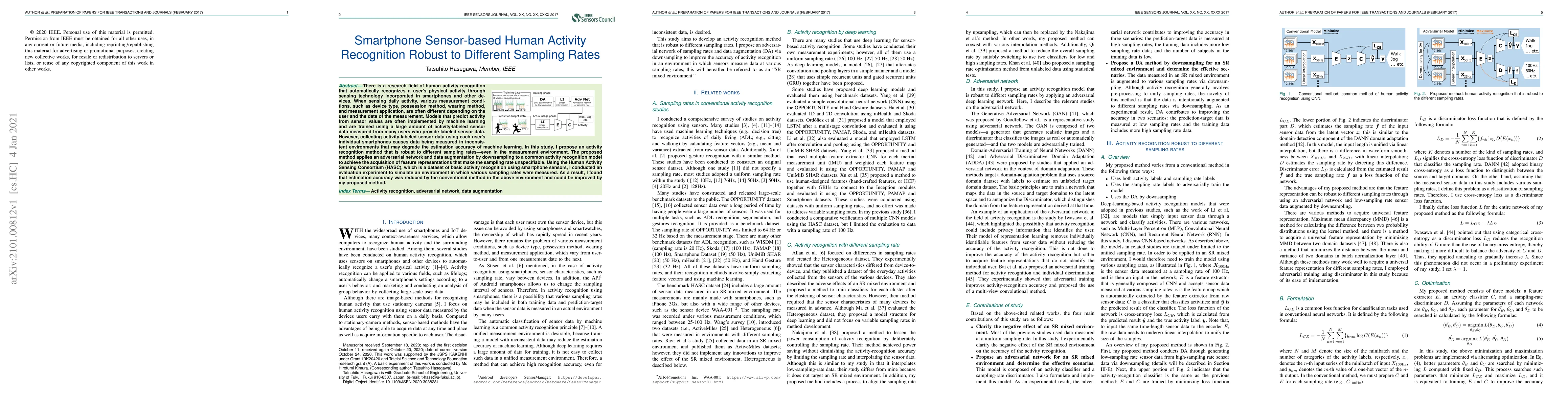 This paper proposes an activity recognition method robust to different sampling rates using adversarial networks and data augmentation. The method aims to improve estimation accuracy in inconsistent measurement environments by making the model invariant to sampling rates, demonstrated through experiments on the HASC dataset.