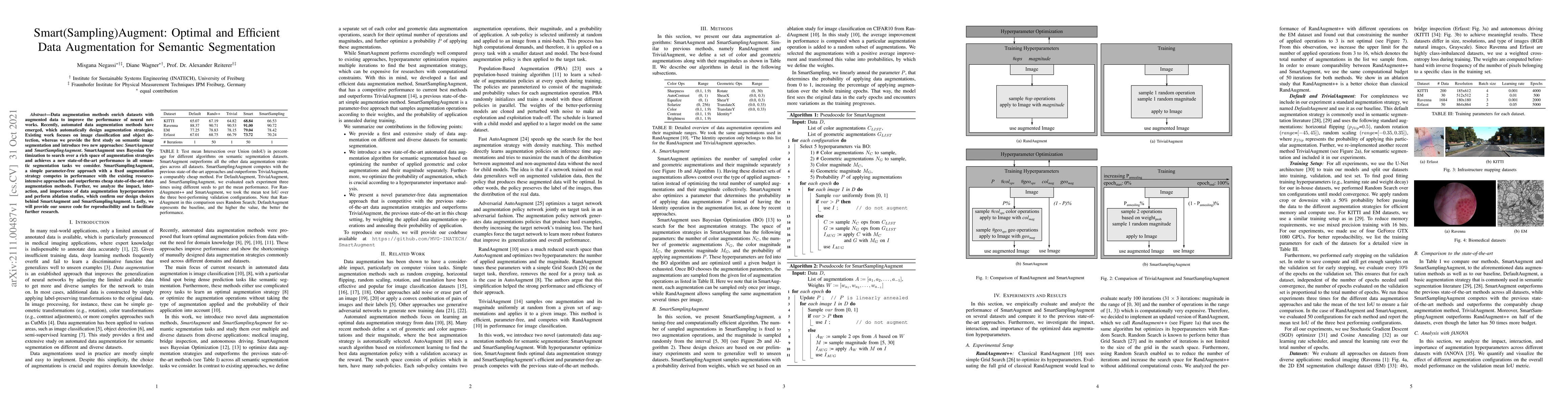 This paper introduces two novel data augmentation methods, SmartAugment and SmartSamplingAugment, specifically for semantic segmentation, achieving state-of-the-art performance with SmartAugment and competitive results with SmartSamplingAugment. The study also analyzes augmentation hyperparameters and provides source code for reproducibility.