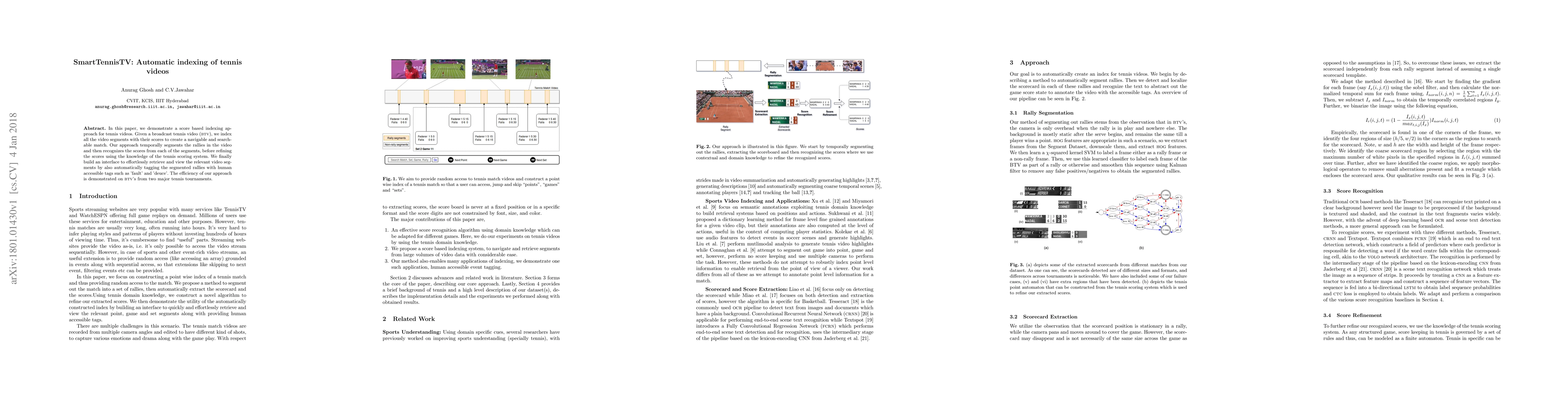 In this paper, we demonstrate a score based indexing approach for tennis videos. Given a broadcast tennis video (BTV), we index all the video segments with their scores to create a navigable and searchable match. Our approach temporally segments the rallies in the video and then recognizes the scores from each of the segments, before refining the scores using the knowledge of the tennis scoring system. We finally build an interface to effortlessly retrieve and view the relevant video segments by also automatically tagging the segmented rallies with human accessible tags such as 'fault' and 'deuce'. The efficiency of our approach is demonstrated on BTV's from two major tennis tournaments.