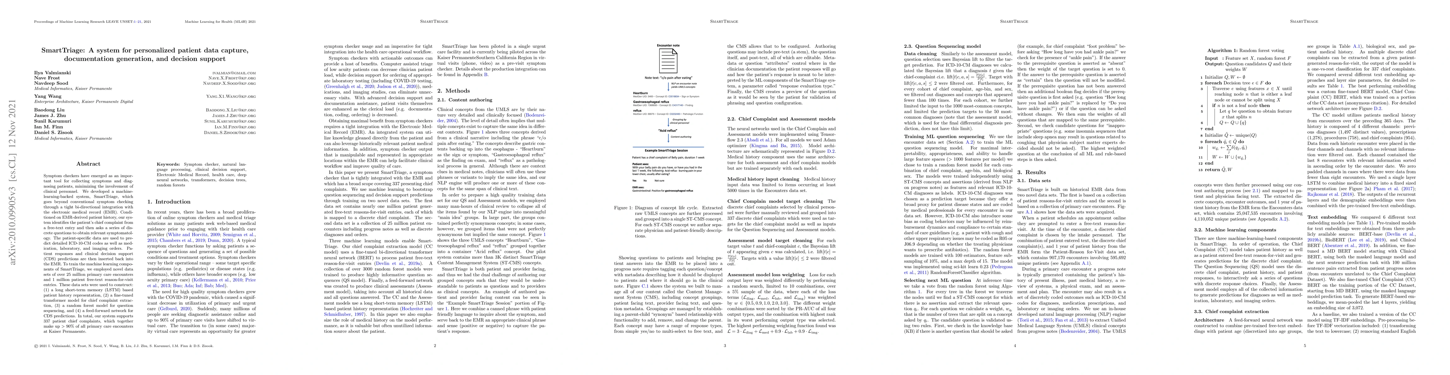 SmartTriage is a machine-learning-backed system that enhances patient data capture and decision support by integrating with electronic medical records to predict ICD-10-CM codes and clinical orders based on patient-specific history and symptoms. It employs advanced models to sequence questions and generate documentation, trained on extensive primary care data sets.