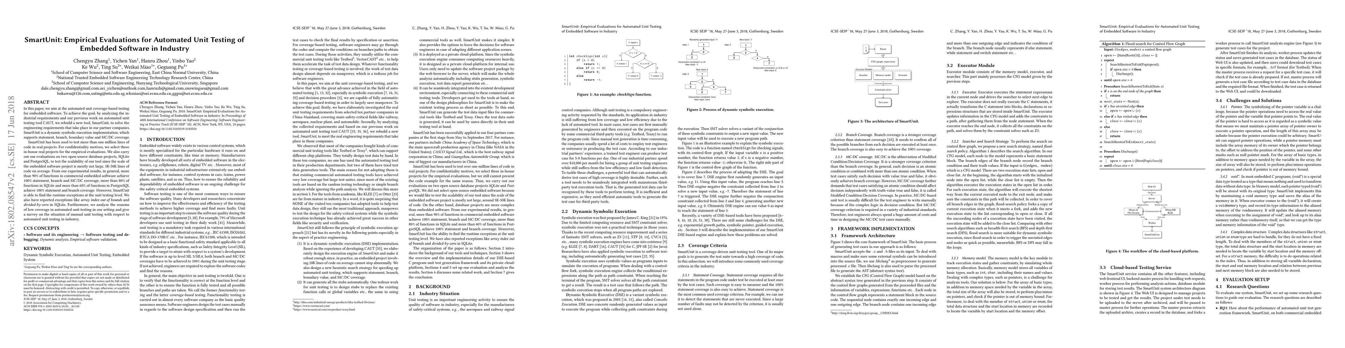SmartUnit is a dynamic symbolic execution tool for automated unit testing of embedded software, achieving high coverage rates in industrial and open-source projects. Experimental results show that it successfully finds runtime exceptions and achieves near-full coverage in commercial embedded software and significant MC/DC coverage in SQLite and PostgreSQL.