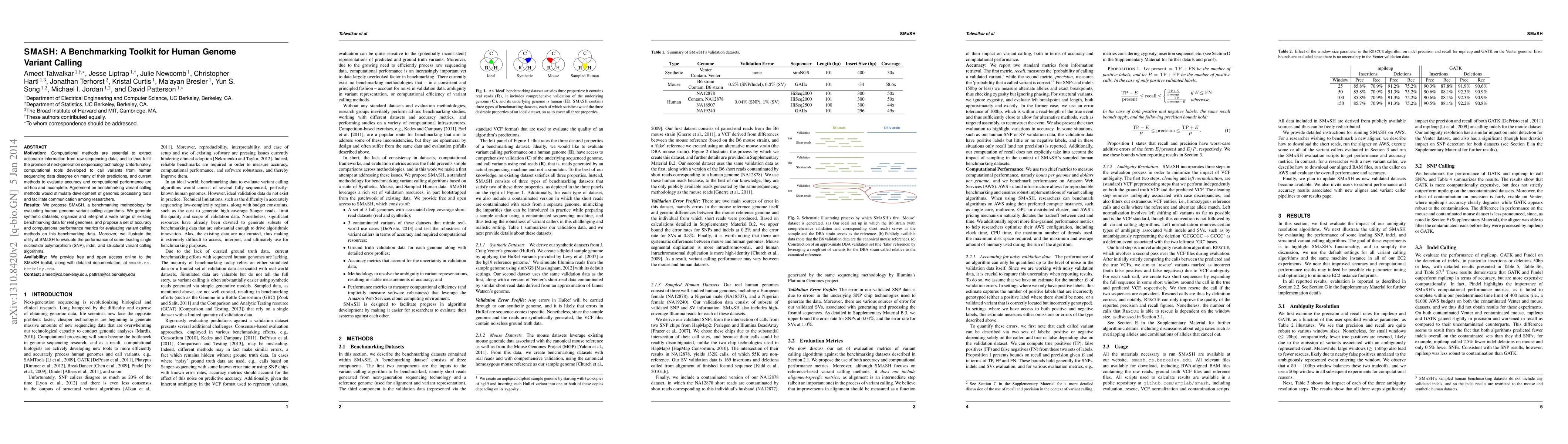 SMaSH is a benchmarking toolkit designed to evaluate human genome variant calling algorithms, addressing the lack of standardized methods for assessing computational accuracy and performance. It provides synthetic datasets, organizes existing benchmarking data, and proposes metrics for comprehensive evaluation.