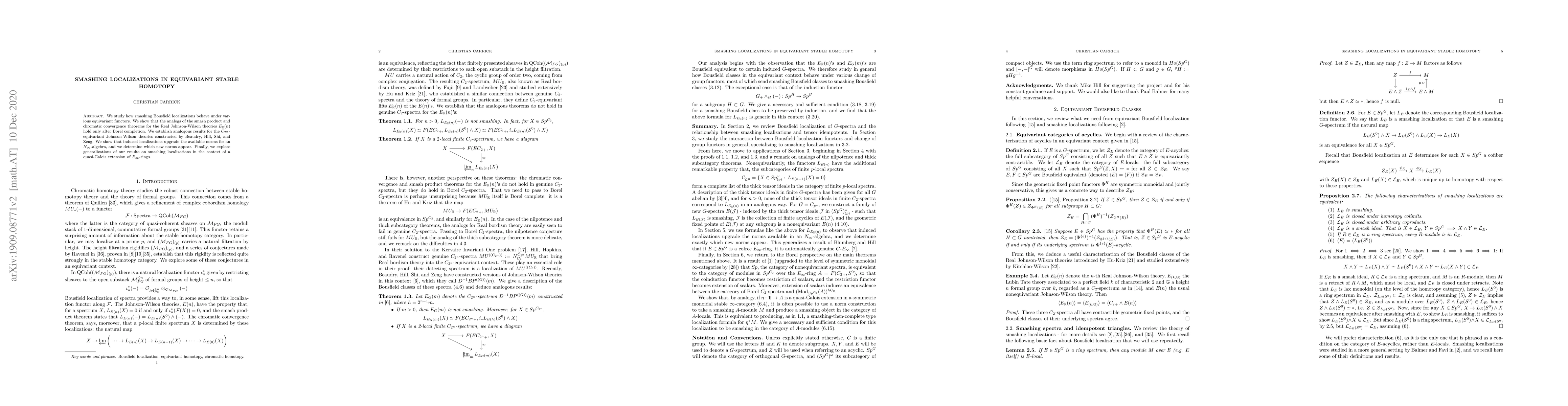 This paper investigates the behavior of smashing Bousfield localizations under equivariant functors, demonstrating that certain theorems for Real Johnson-Wilson theories hold post-Borel completion. It also establishes analogous results for $C_{2^n}$-equivariant Johnson-Wilson theories and explores how induced localizations enhance norms for $N_\infty$-algebras.