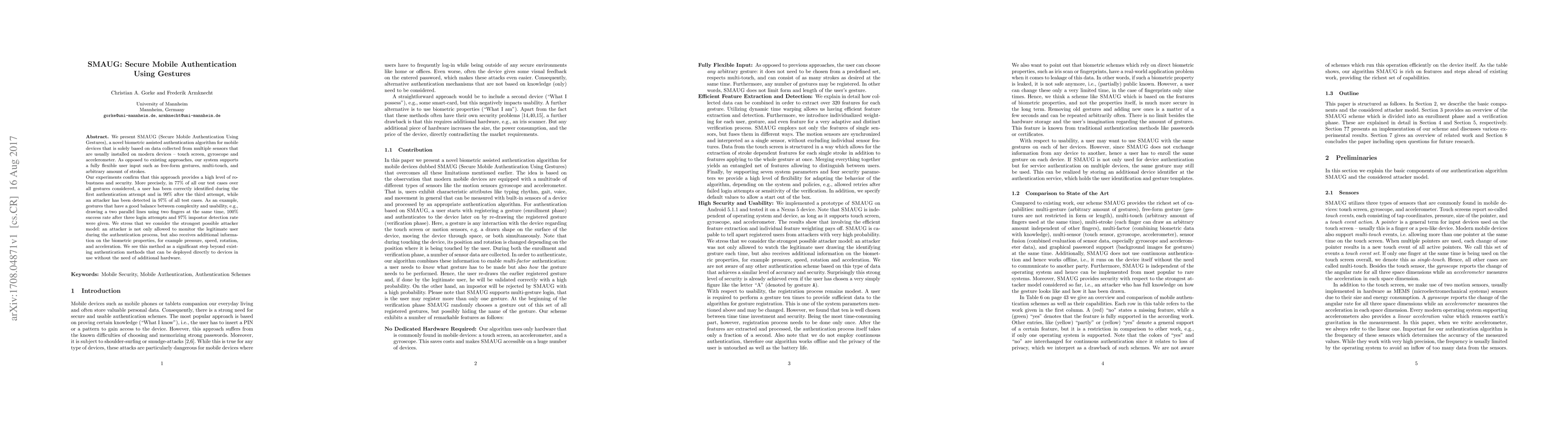 SMAUG is a novel biometric authentication method for mobile devices that uses gestures from touch screen, gyroscope, and accelerometer data. It achieves high accuracy and security, identifying legitimate users in 77% of cases on the first attempt and 99% after three attempts, while detecting attackers in 97% of cases, even under stringent conditions.