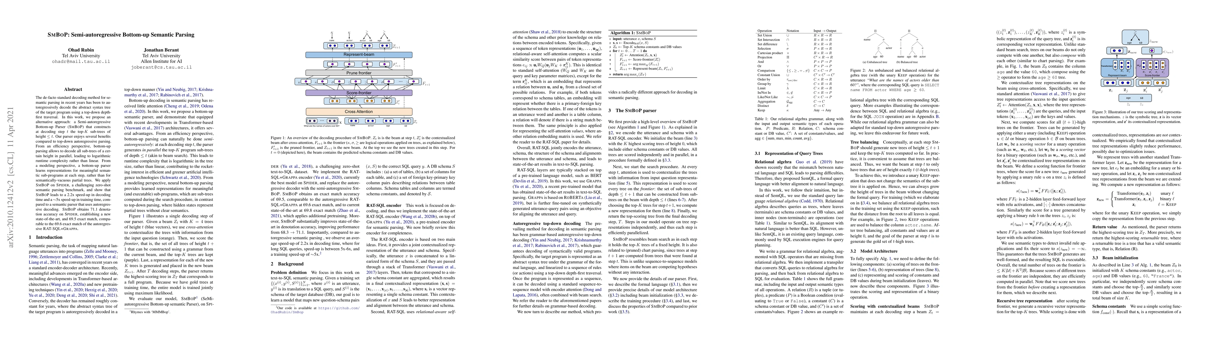 This paper proposes a Semi-autoregressive Bottom-up Parser (SmBoP) for semantic parsing, which constructs sub-trees in parallel, achieving logarithmic runtime complexity. SmBoP outperforms autoregressive methods in speed and achieves a new state-of-the-art denotation accuracy of 71.1 on the Spider benchmark.