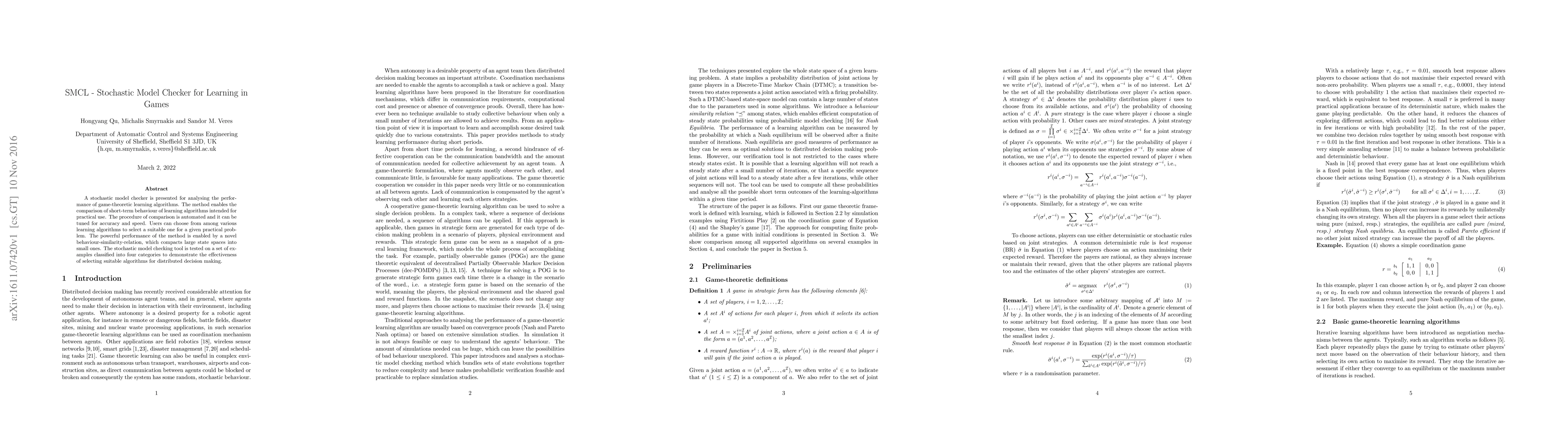 The paper introduces SMCL, a stochastic model checker for evaluating game-theoretic learning algorithms, enabling automated comparisons of their short-term behavior. The tool uses a novel behavior-similarity-relation to manage large state spaces, tested on examples for distributed decision making.