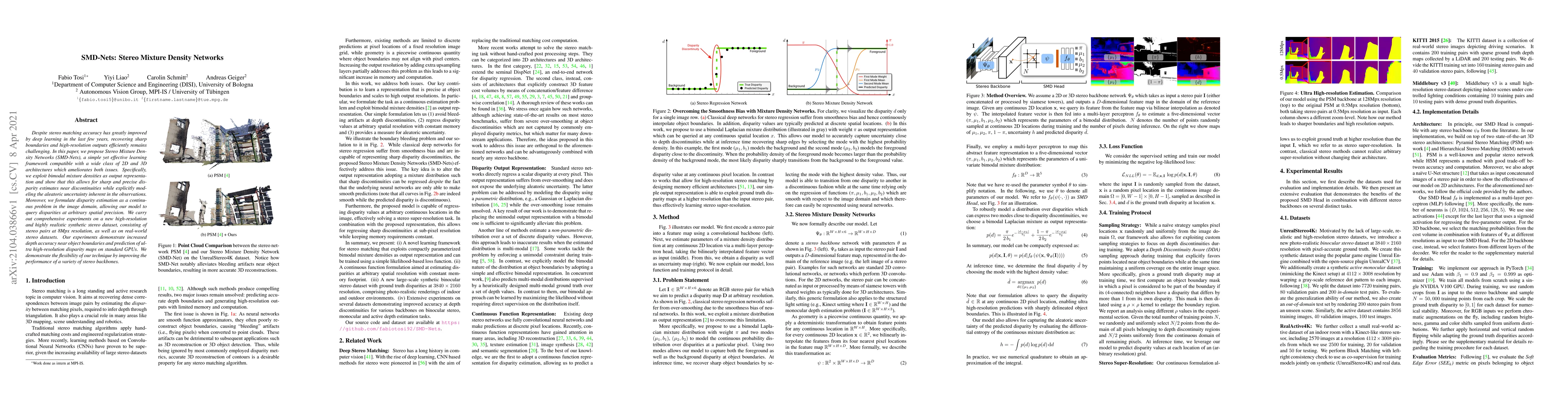 Researchers developed SMD-Nets, a learning framework that improves stereo matching accuracy near object boundaries and predicts ultra-high-resolution disparity maps. The model uses bimodal mixture densities to handle aleatoric uncertainty in observations.