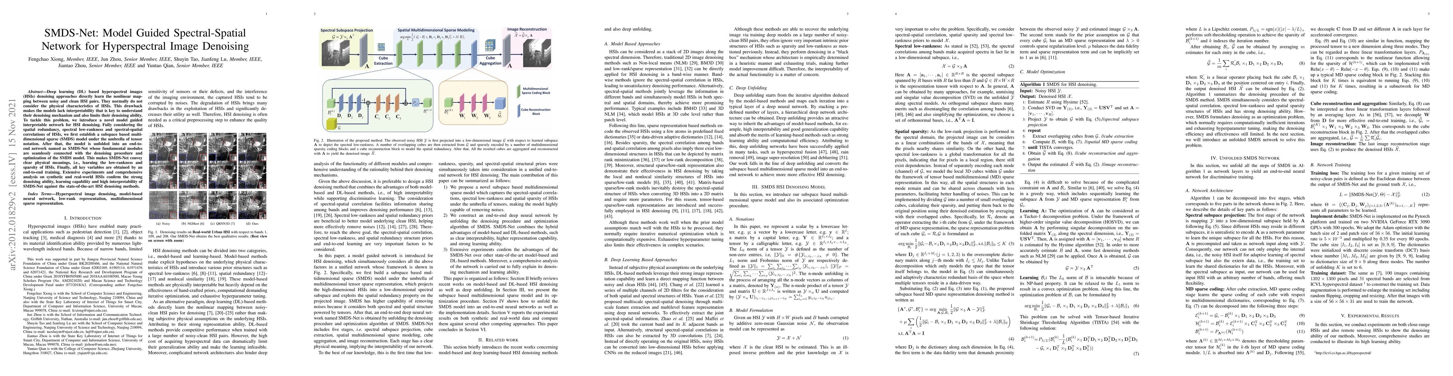 SMDS-Net introduces a model guided interpretable network for hyperspectral image denoising, leveraging spatial redundancy, spectral low-rankness, and spectral-spatial properties to achieve clear physical meanings and superior denoising performance compared to state-of-the-art methods.