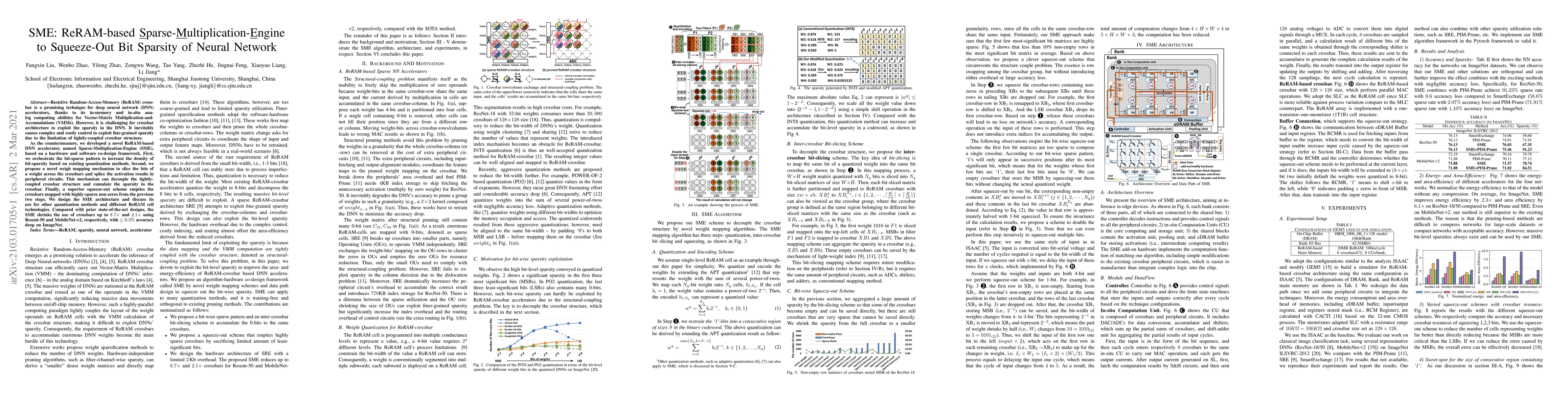 The paper introduces a novel ReRAM-based Sparse-Multiplication-Engine (SME) to enhance the exploitation of bit sparsity in deep neural networks (DNNs). The SME employs a hardware and software co-design framework to optimize the use of ReRAM crossbars, achieving up to 8.7x and 2.1x reduction in crossbar usage for ResNet-50 and MobileNet-v2, respectively, with minimal accuracy loss.