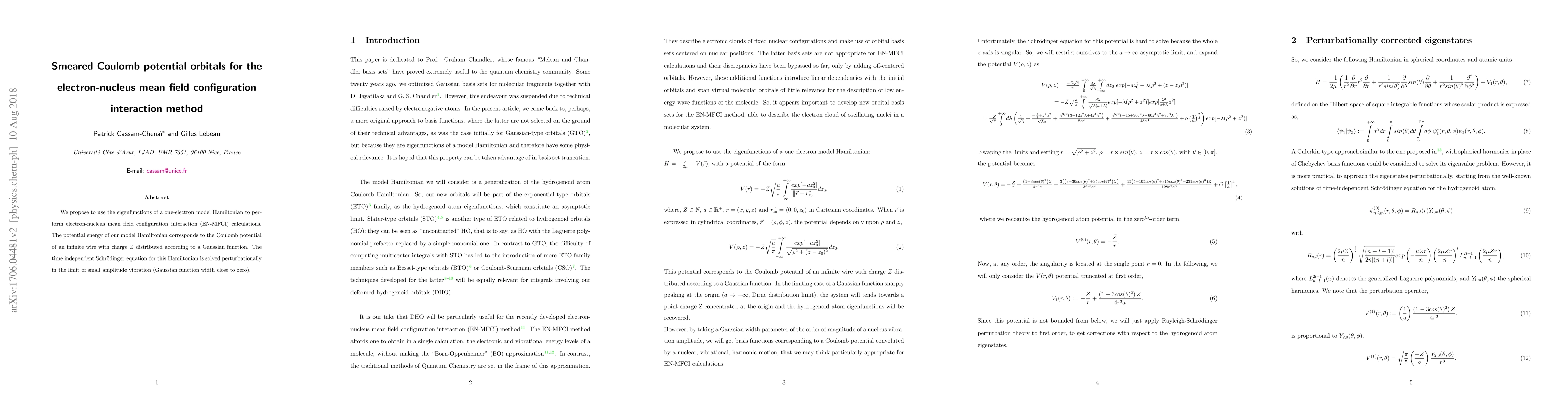 The paper proposes using eigenfunctions of a one-electron model Hamiltonian with a smeared Coulomb potential for EN-MFCI calculations. The potential energy corresponds to an infinite wire with charge Z distributed as a Gaussian function, solved perturbatively for small amplitude vibration.