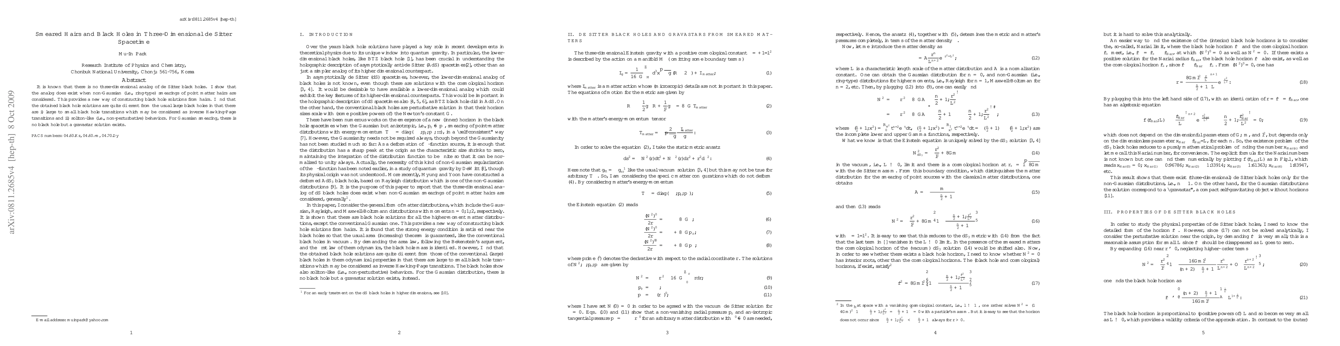 Title: Smeared Hairs and Black Holes in Three-Dimensional de Sitter Spacetime Summary: The paper demonstrates the existence of a three-dimensional de Sitter black hole analog through non-Gaussian smearing of point matter hairs, revealing new black hole construction methods, large-to-small black hole transitions, and soliton-like behaviors, contrasting with usual large black holes and gravastar solutions from Gaussian smearing.
