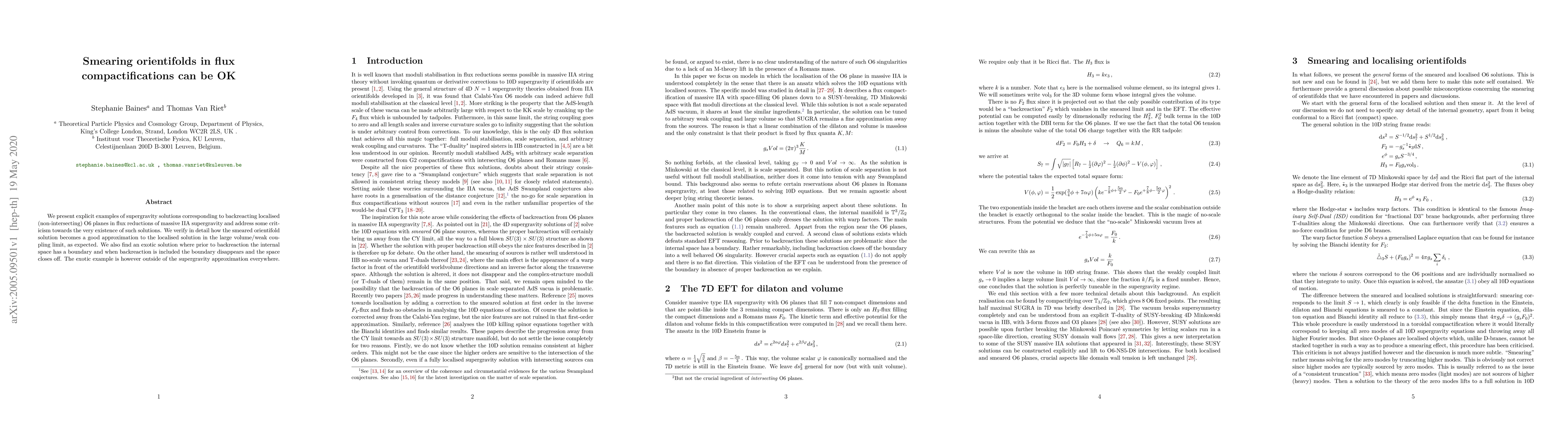 This paper provides explicit examples of supergravity solutions for backreacting O6 planes in flux compactifications, addressing criticisms of their existence. It demonstrates that smeared orientifold solutions approximate localised solutions well in the large volume/weak coupling limit, and introduces an exotic solution where the internal space's boundary disappears post-backreaction.