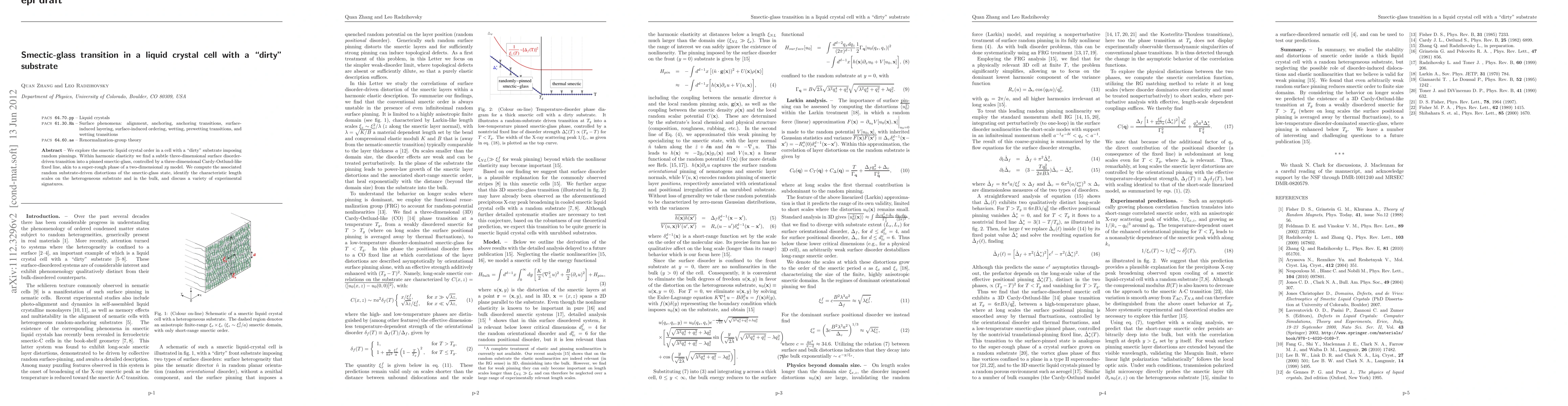 This study investigates the smectic-glass transition in liquid crystals on a "dirty" substrate with random pinnings, revealing a three-dimensional disorder-driven transition controlled by a Cardy-Ostlund-like fixed line, and discusses the associated distortions and length scales, along with potential experimental signatures.