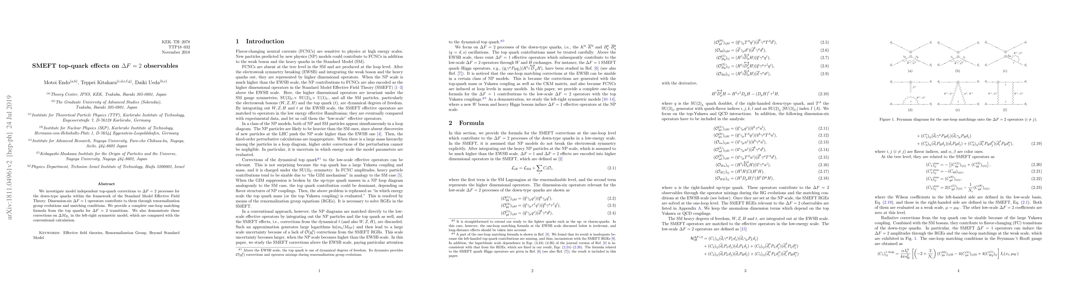 This research derives a one-loop matching formula for top-quark corrections to DeltaF=2 processes in the Standard Model Effective Field Theory (SMEFT). It compares these corrections to DeltaM_Bs in a left-right symmetric model, offering a model-independent approach to understand top-quark impacts on such processes.