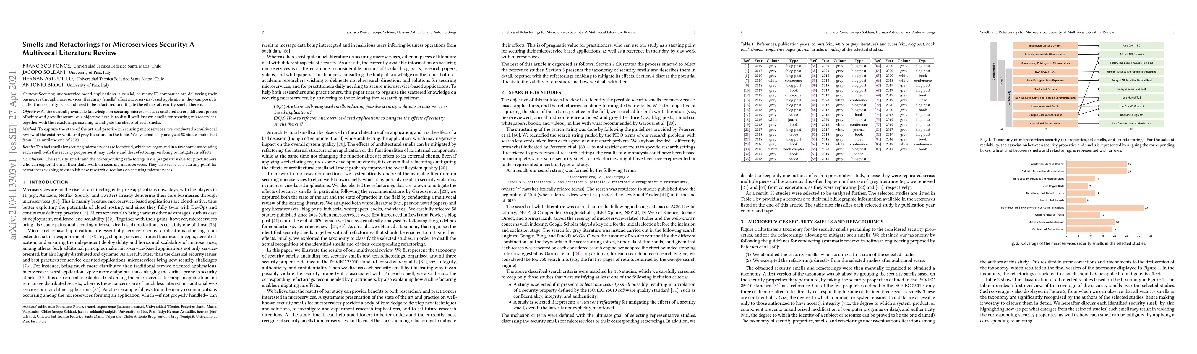 This paper conducts a multivocal literature review to identify ten security "smells" in microservices and their corresponding refactorings. The study systematically analyzes 58 studies to provide a taxonomy of security issues and solutions, offering practical insights for both practitioners and researchers in securing microservice-based applications.