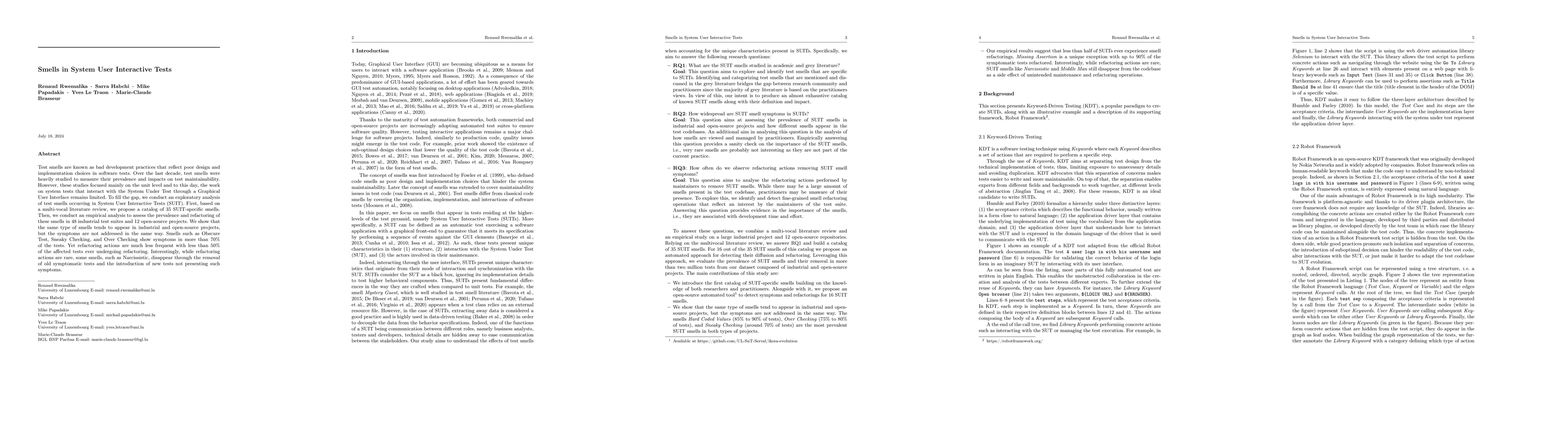 Test smells are known as bad development practices that reflect poor design and implementation choices in software tests. Over the last decade, test smells were heavily studied to measure their prevalence and impacts on test maintainability. However, these studies focused mainly on the unit level and to this day, the work on system tests that interact with the System Under Test through a Graphical User Interface remains limited. To fill the gap, we conduct an exploratory analysis of test smells occurring in System User Interactive Tests (SUIT). First, based on a multi-vocal literature review, we propose a catalog of 35 SUIT-specific smells. Then, we conduct an empirical analysis to assess the prevalence and refactoring of these smells in 48 industrial test suites and 12 open-source projects. We show that the same type of smells tends to appear in industrial and open-source projects, but the symptoms are not addressed in the same way. Smells such as Obscure Test, Sneaky Checking, and Over Checking show symptoms in more than 70% of the tests. Yet refactoring actions are much less frequent with less than 50% of the affected tests ever undergoing refactoring. Interestingly, while refactoring actions are rare, some smells, such as Narcissistic, disappear through the removal of old symptomatic tests and the introduction of new tests not presenting such symptoms.