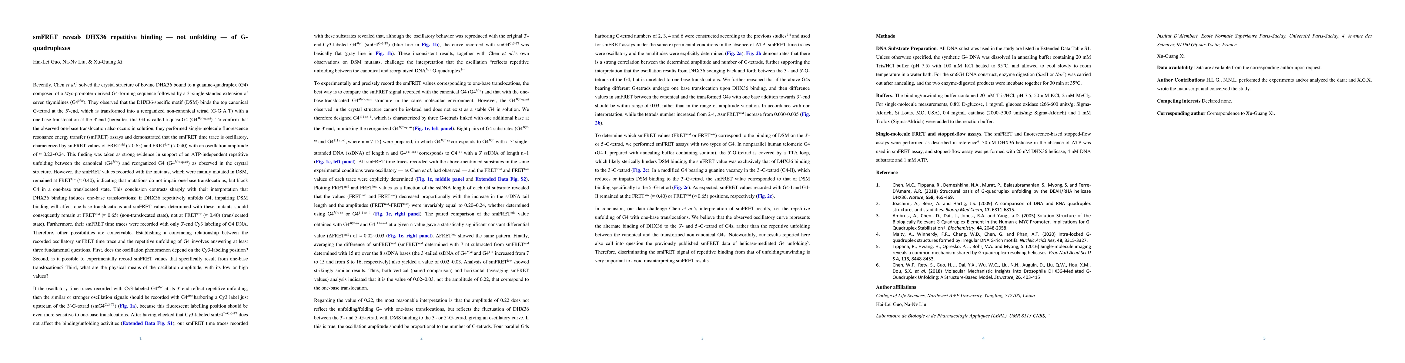 Our data challenge Chen et al.'s interpretation of smFRET results, i.e. the repetitive unfolding of G4 with one-base translocations. We believe that the observed oscillatory curve represents the alternate binding of DHX36 to the 3' and 5'G-tetrad of G4s, rather than the repetitive unfolding between the canonical and the transformed non-canonical G4s. Noteworthily, our results reported here also call into question the previously published smFRET data of helicase-mediated G4 unfolding. Therefore,discriminating the smFRET signal of repetitive binding from that of unfolding is very important to avoid misinterpreting smFRET results.