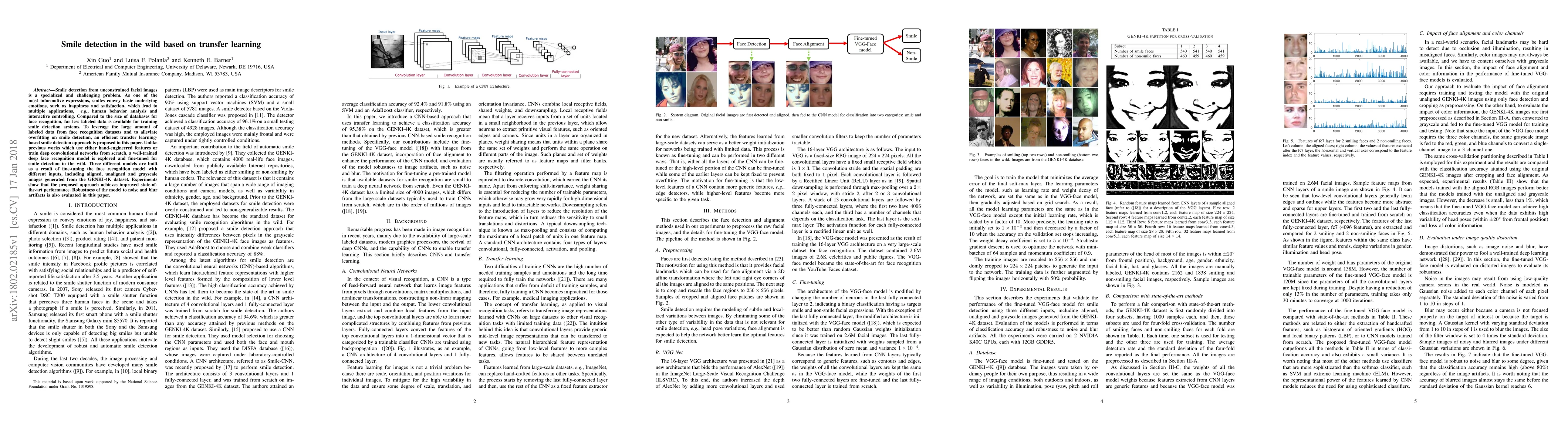 This paper proposes a transfer learning-based approach for smile detection in unconstrained images, leveraging large face recognition datasets to fine-tune a deep model for improved performance. The method achieves state-of-the-art results and demonstrates robustness to noise and blur.