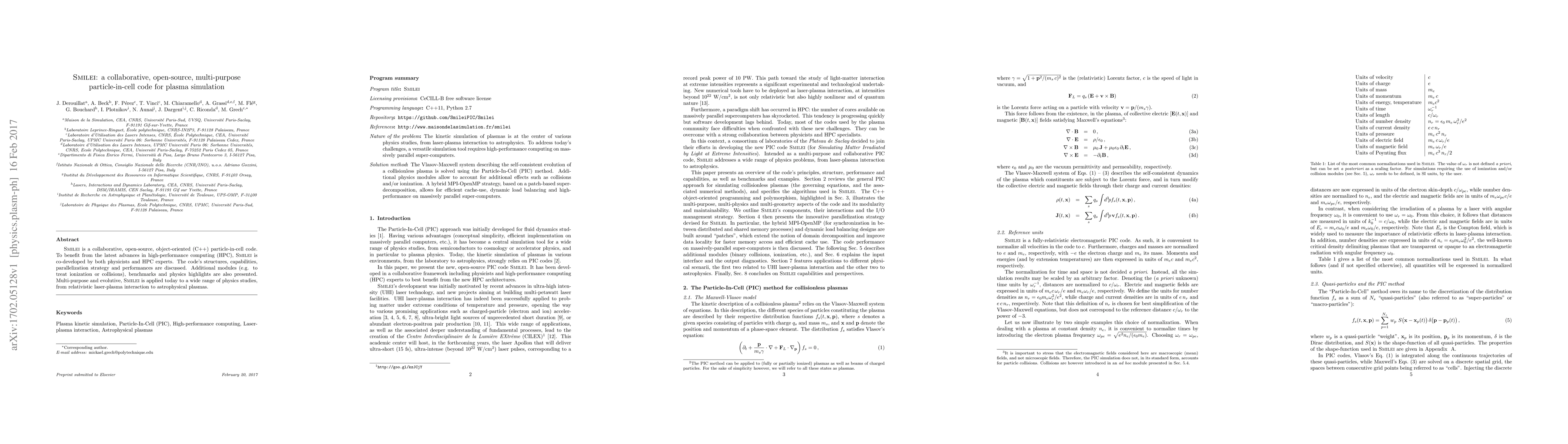 SMILEI is an open-source, collaborative particle-in-cell code for plasma simulation, developed by physicists and HPC experts to leverage high-performance computing. It features modular extensions, parallelization, and is applied to diverse plasma physics studies.