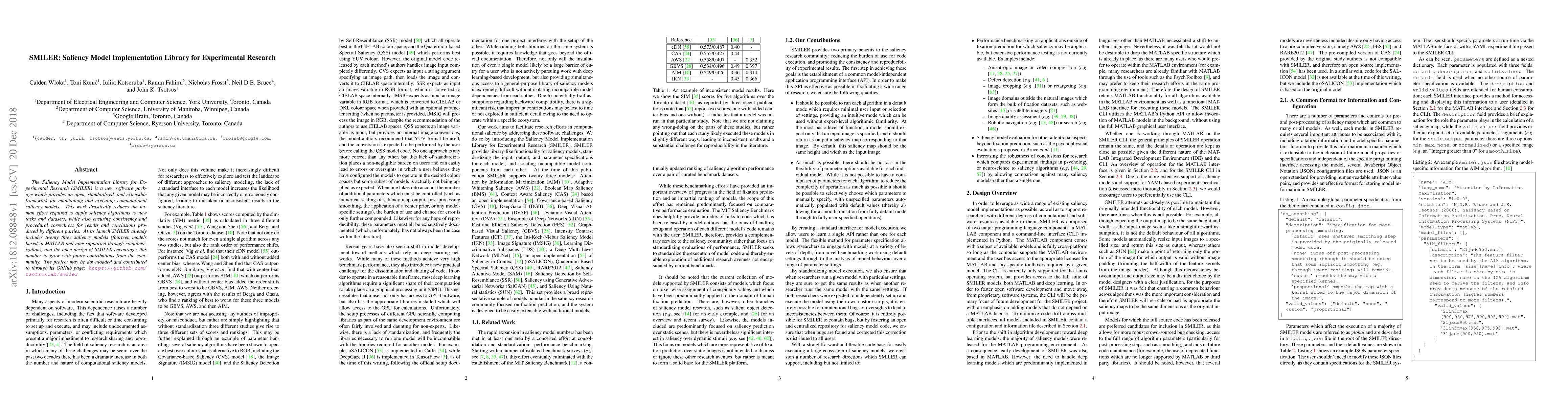 The Saliency Model Implementation Library for Experimental Research (SMILER) is a new software package which provides an open, standardized, and extensible framework for maintaining and executing computational saliency models. This work drastically reduces the human effort required to apply saliency algorithms to new tasks and datasets, while also ensuring consistency and procedural correctness for results and conclusions produced by different parties. At its launch SMILER already includes twenty three saliency models (fourteen models based in MATLAB and nine supported through containerization), and the open design of SMILER encourages this number to grow with future contributions from the community. The project may be downloaded and contributed to through its GitHub page: https://github.com/tsotsoslab/smiler