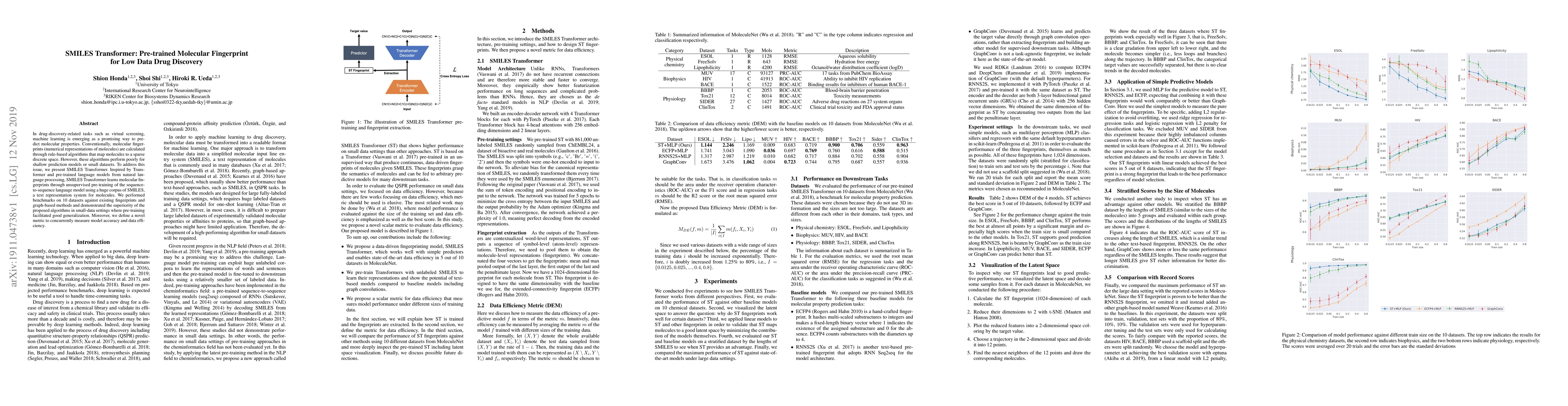 The SMILES Transformer leverages pre-trained language models to learn molecular fingerprints from large SMILES corpora, outperforming conventional methods in small-data drug discovery scenarios. Benchmarks on 10 datasets show its superior performance and a new metric is introduced to evaluate both accuracy and data efficiency.