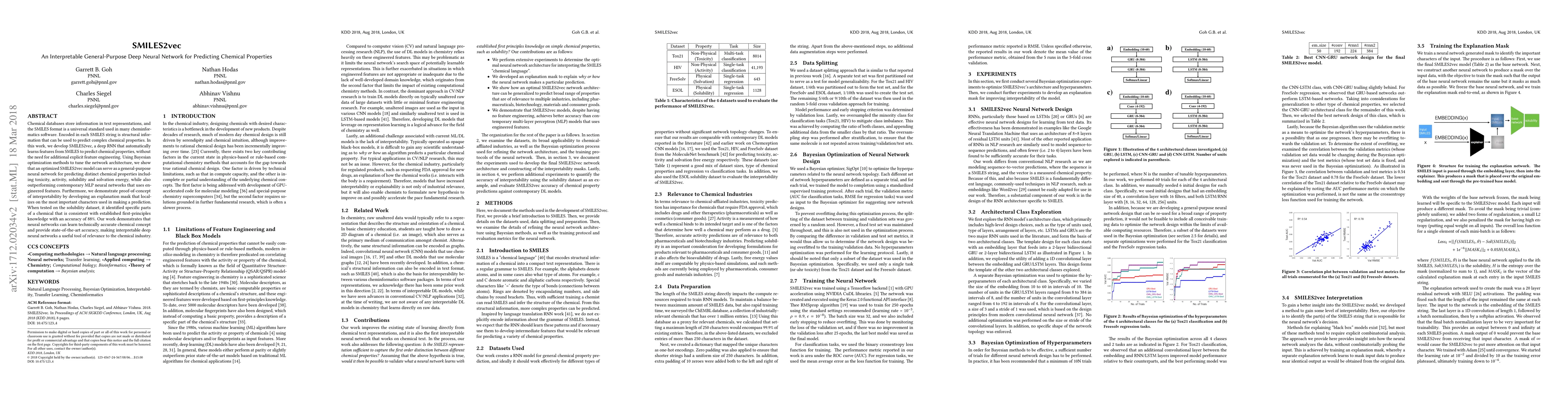 SMILES2Vec is a deep RNN model that learns features from SMILES strings to predict chemical properties without explicit feature engineering, outperforming traditional MLPs. It demonstrates interpretability through an explanation mask, achieving 88% accuracy in identifying important chemical parts for solubility predictions.