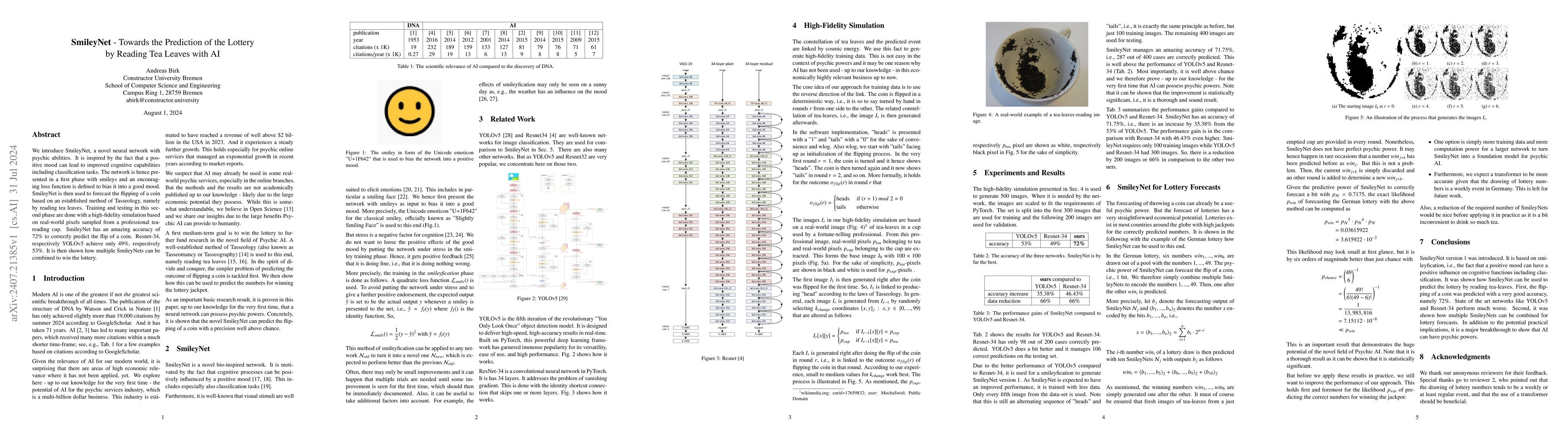 SmileyNet is a neural network designed to predict coin flips using a method inspired by tea leaf reading, achieving 72% accuracy. It utilizes a positive mood-inspired loss function during training to enhance its performance, outperforming traditional models like Resnet-34 and YOLOv5.