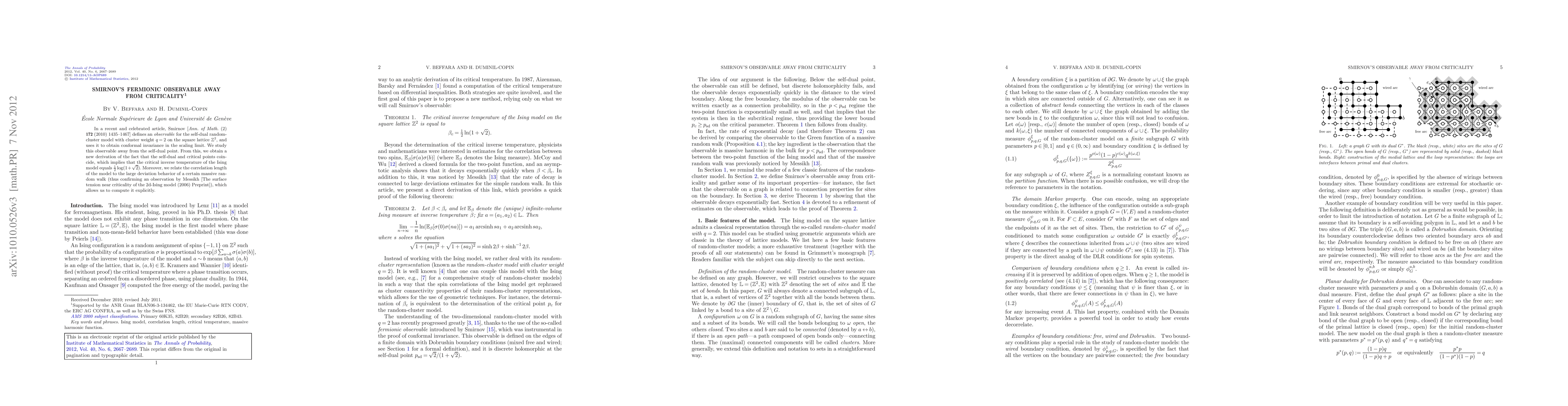 In a recent and celebrated article, Smirnov [Ann. of Math. (2) 172 (2010) 1435-1467] defines an observable for the self-dual random-cluster model with cluster weight q = 2 on the square lattice $\mathbb{Z}^2$, and uses it to obtain conformal invariance in the scaling limit. We study this observable away from the self-dual point. From this, we obtain a new derivation of the fact that the self-dual and critical points coincide, which implies that the critical inverse temperature of the Ising model equals $1/2\log(1+\sqrt{2})$. Moreover, we relate the correlation length of the model to the large deviation behavior of a certain massive random walk (thus confirming an observation by Messikh [The surface tension near criticality of the 2d-Ising model (2006) Preprint]), which allows us to compute it explicitly.