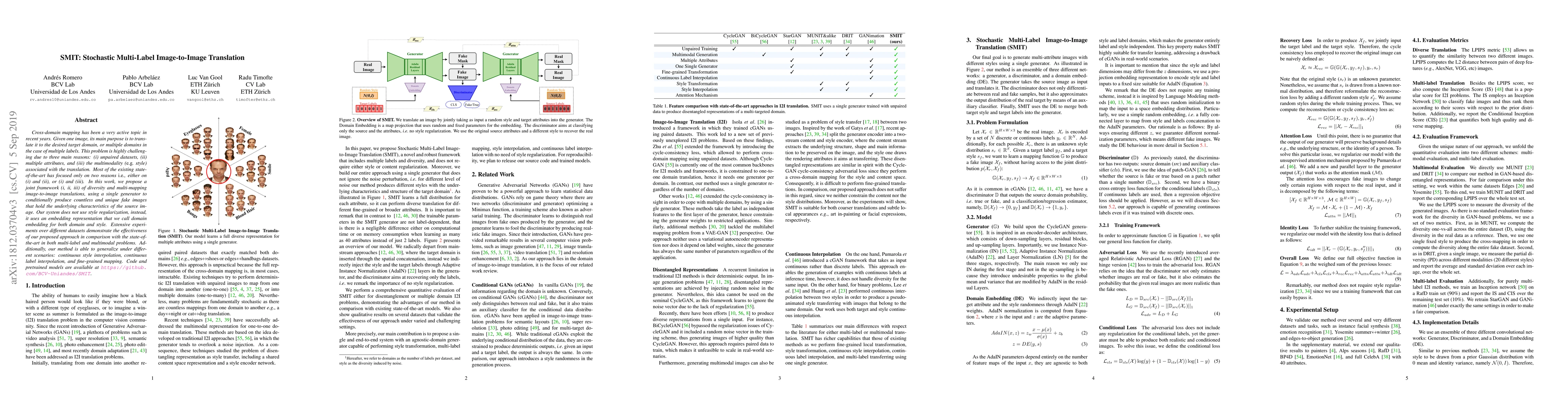 The paper proposes SMIT, a framework for unpaired, multi-label, and multimodal image-to-image translation without style regularization, using domain embeddings. Experiments show its effectiveness and generalization across various translation scenarios compared to state-of-the-art methods.