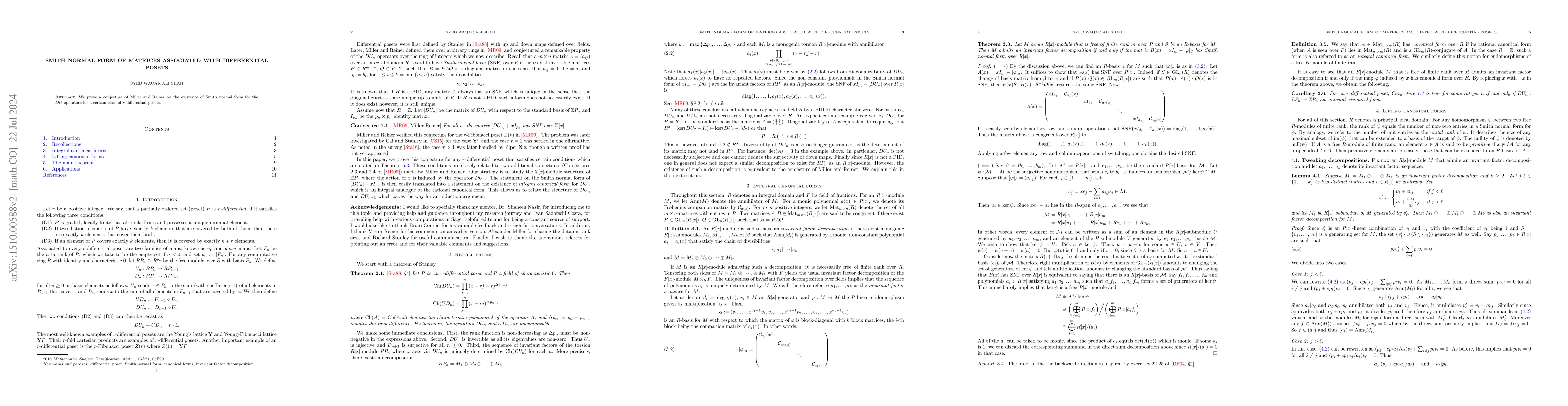 We prove a conjecture of Miller and Reiner on the Smith Normal Form of the operator $DU_{n}$ associated with a differential poset under certain conditions. We do so by proving that the conjecture is equivalent to the existence of a certain decomposition of the $ \mathbb{Z}[x]$-module $ (\mathbb{Z}^{p_{n} }, DU_{n}) $, similar to the invariant factor decomposition of $ \mathbb{Q}[x]$-modules. We then use our result to verify the conjecture in certain special cases.
