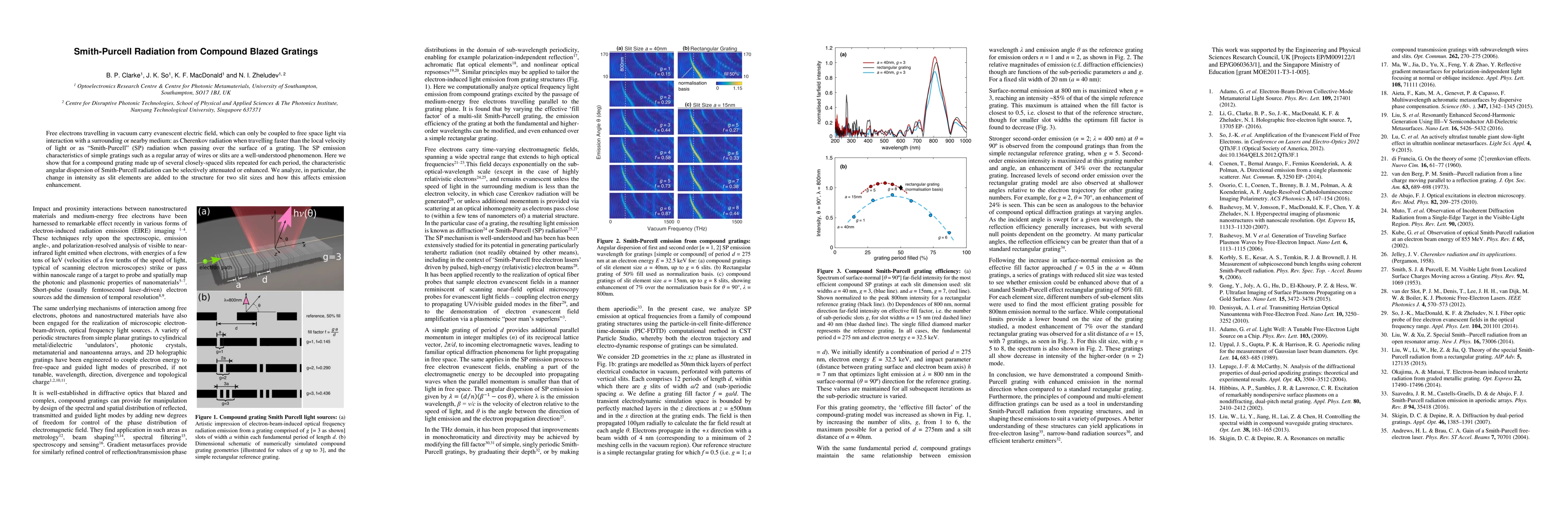 Researchers investigated Smith-Purcell radiation from compound blazed gratings, finding that adding slit elements can selectively attenuate or enhance the characteristic angular dispersion of SP radiation, depending on slit size.