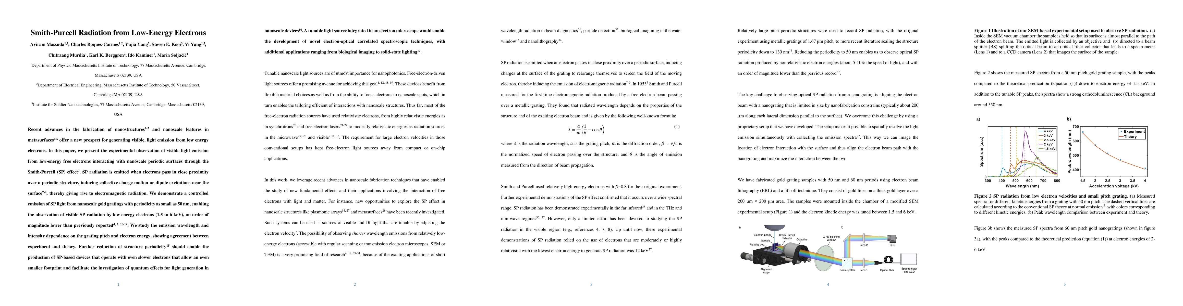 Recent advances in the fabrication of nanostructures and nanoscale features in metasurfaces offer a new prospect for generating visible, light emission from low energy electrons. In this paper, we present the experimental observation of visible light emission from low-energy free electrons interacting with nanoscale periodic surfaces through the Smith-Purcell (SP) effect. SP radiation is emitted when electrons pass in close proximity over a periodic structure, inducing collective charge motion or dipole excitations near the surface, thereby giving rise to electromagnetic radiation. We demonstrate a controlled emission of SP light from nanoscale gold gratings with periodicity as small as 50 nm, enabling the observation of visible SP radiation by low energy electrons (1.5 to 6 keV), an order of magnitude lower than previously reported. We study the emission wavelength and intensity dependence on the grating pitch and electron energy, showing agreement between experiment and theory. Further reduction of structure periodicity should enable the production of SP-based devices that operate with even slower electrons that allow an even smaller footprint and facilitate the investigation of quantum effects for light generation in nanoscale devices. A tunable light source integrated in an electron microscope would enable the development of novel electron-optical correlated spectroscopic techniques, with additional applications ranging from biological imaging to solid-state lighting.