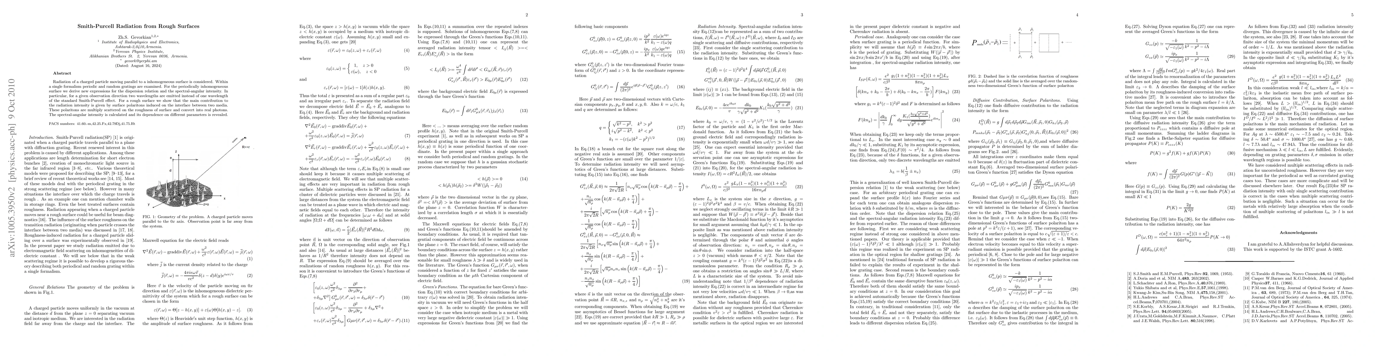 This paper investigates Smith-Purcell radiation from both periodic and random gratings, deriving new expressions for the dispersion relation and spectral-angular intensity. It finds that rough surfaces induce surface polaritons that scatter and convert into real photons, altering the radiation pattern compared to smooth surfaces.