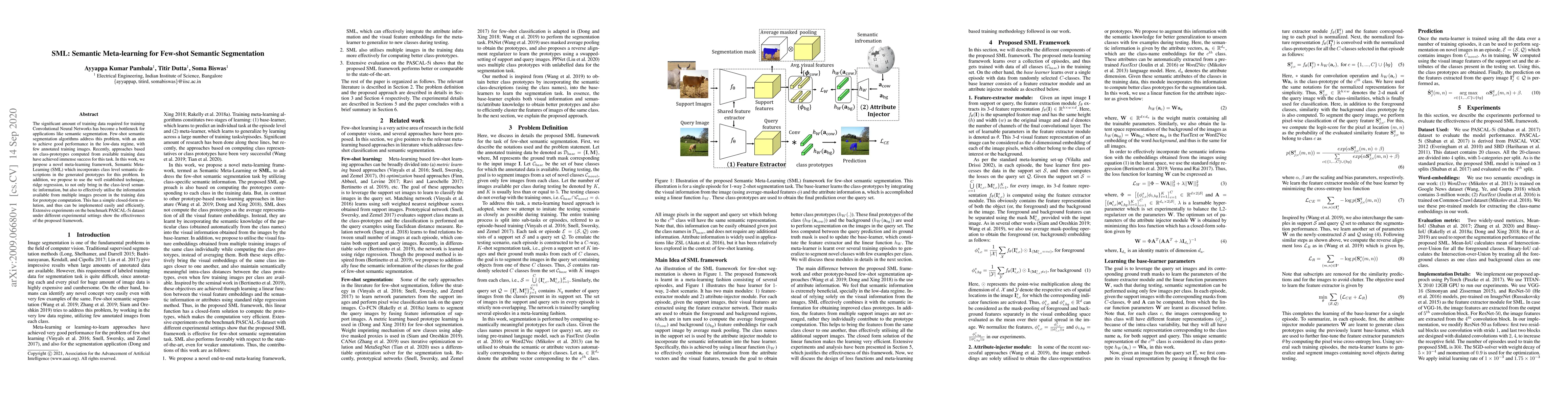 This paper introduces Semantic Meta-Learning (SML), a novel meta-learning framework for few-shot semantic segmentation that leverages class-level semantic descriptions in prototype generation. It employs ridge regression to efficiently utilize multi-image training data, demonstrating improved performance on the PASCAL-5i dataset.