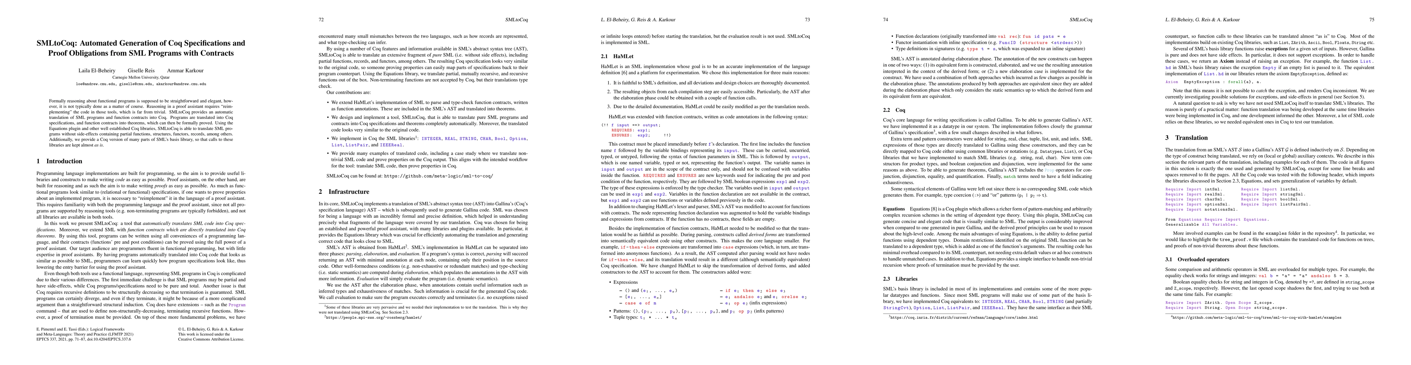 SMLtoCoq automates the translation of SML programs and contracts into Coq specifications and proof obligations, easing the formal reasoning process. It translates SML constructs and contracts into Coq theorems, leveraging established Coq libraries and an adapted SML basis library.