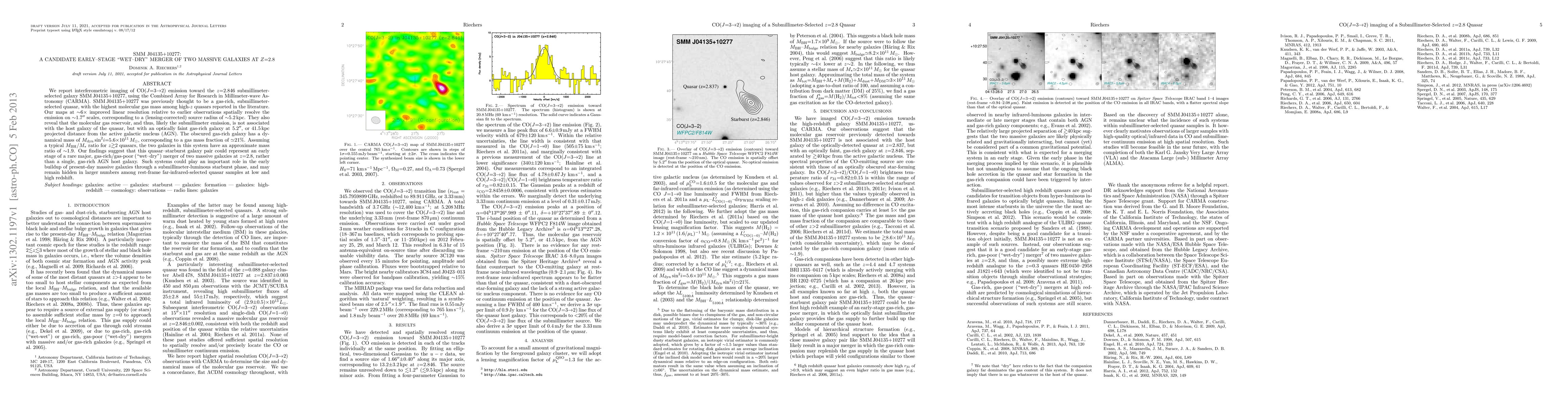 We report interferometric imaging of CO(J=3-2) emission toward the z=2.846 submillimeter-selected galaxy SMM J04135+10277, using the Combined Array for Research in Millimeter-wave Astronomy (CARMA). SMM J04135+10277 was previously thought to be a gas-rich, submillimeter-selected quasar, with the highest molecular gas mass among high-z quasars reported in the literature. Our maps at ~6x improved linear resolution relative to earlier observations spatially resolve the emission on ~1.7" scales, corresponding to a (lensing-corrected) source radius of ~5.2 kpc. They also reveal that the molecular gas reservoir, and thus, likely the submillimeter emission, is not associated with the host galaxy of the quasar, but with an optically faint gas-rich galaxy at 5.2", or 41.5 kpc projected distance from the active galactic nucleus (AGN). The obscured gas-rich galaxy has a dynamical mass of M_dyn sin2(i)=5.6x10^11 M_sun, corresponding to a gas mass fraction of ~21%. Assuming a typical M_BH/M* ratio for z>2 quasars, the two galaxies in this system have an approximate mass ratio of ~1.9. Our findings suggest that this quasar-starburst galaxy pair could represent an early stage of a rare major, gas-rich/gas-poor ("wet-dry") merger of two massive galaxies at z=2.8, rather than a single, gas-rich AGN host galaxy. Such systems could play an important role in the early buildup of present-day massive galaxies through a submillimeter-luminous starburst phase, and may remain hidden in larger numbers among rest-frame far-infrared-selected quasar samples at low and high redshift.
