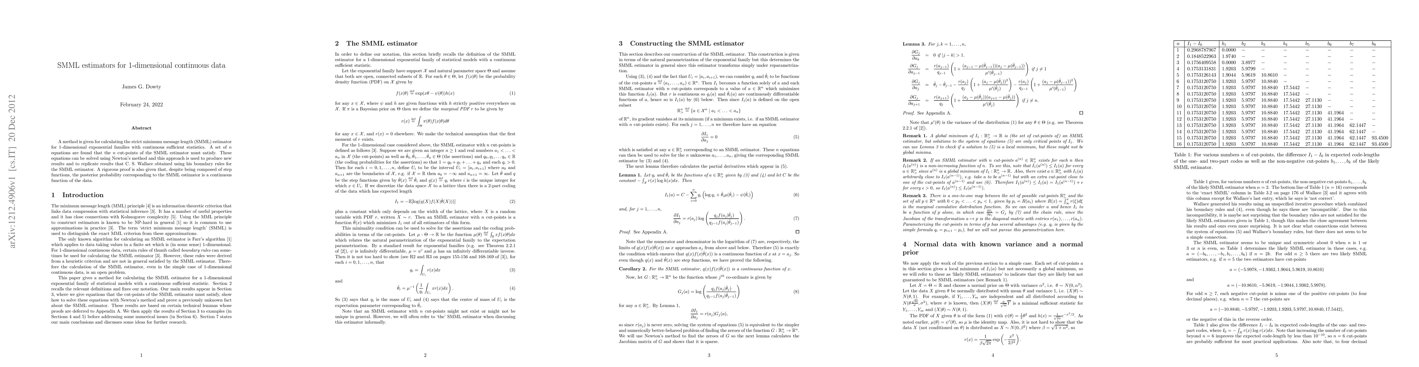 This paper presents a method for calculating strict minimum message length (SMML) estimators for 1-dimensional continuous data within exponential families, solving a set of equations using Newton's method to determine the cut-points, and proving the continuity of the posterior probability despite the step function nature of the SMML estimator.