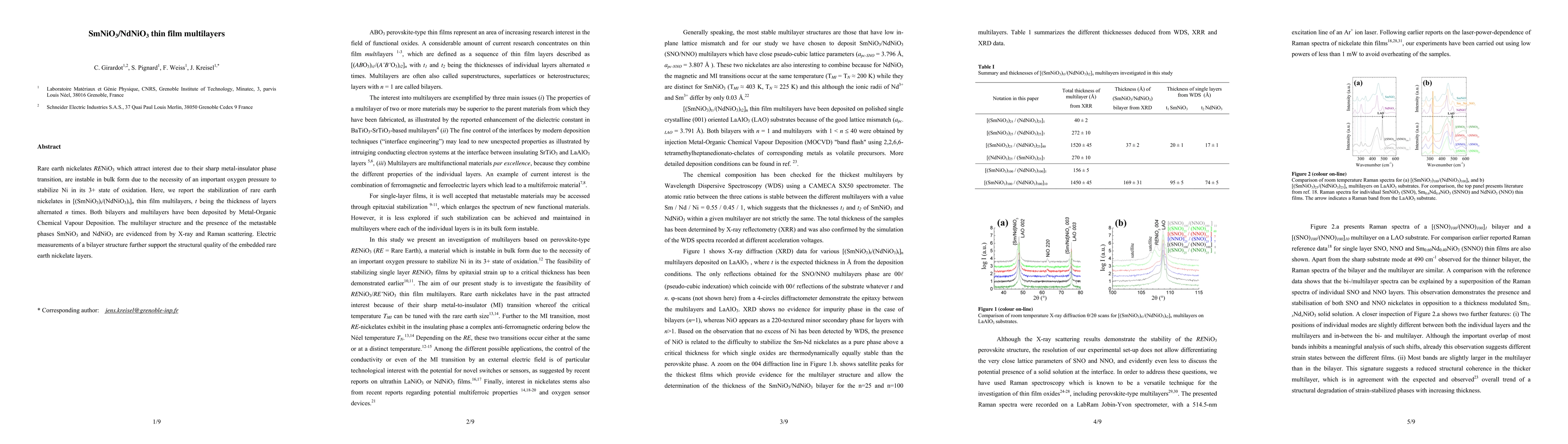 This paper reports the stabilization of rare earth nickelates SmNiO3 and NdNiO3 in thin film multilayers using Metal-Organic Chemical Vapour Deposition, evidenced by X-ray and Raman scattering, and confirmed by electric measurements.