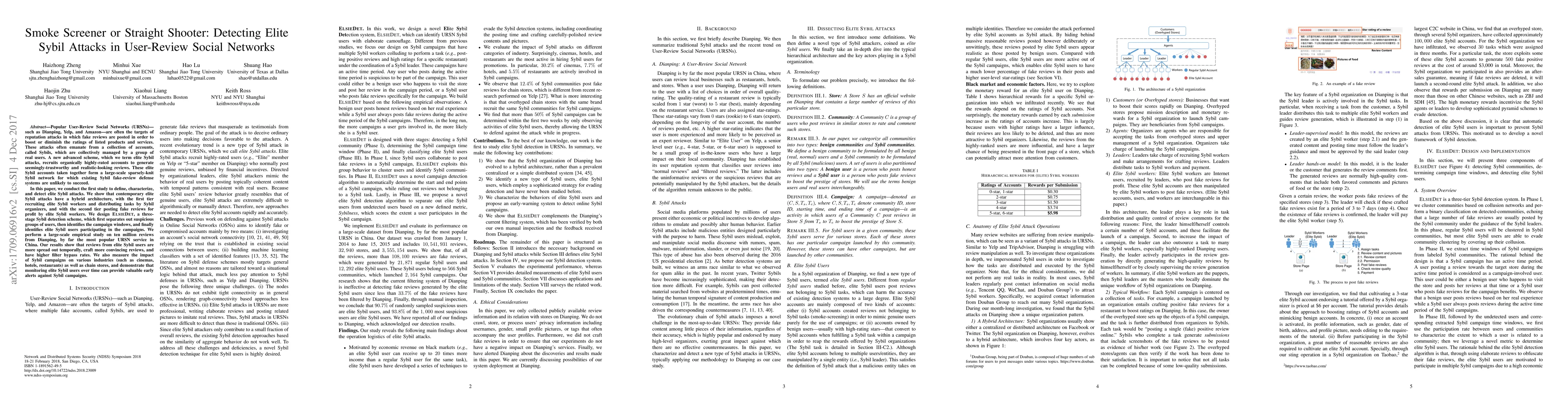 This paper investigates elite Sybil attacks in User-Review Social Networks, where highly-rated fake accounts generate trustworthy reviews. It introduces ElsieDet, a three-stage detection scheme, and demonstrates its effectiveness through a large-scale empirical study on Dianping, revealing that elite Sybil users craft more convincing reviews and have higher filter bypass rates.