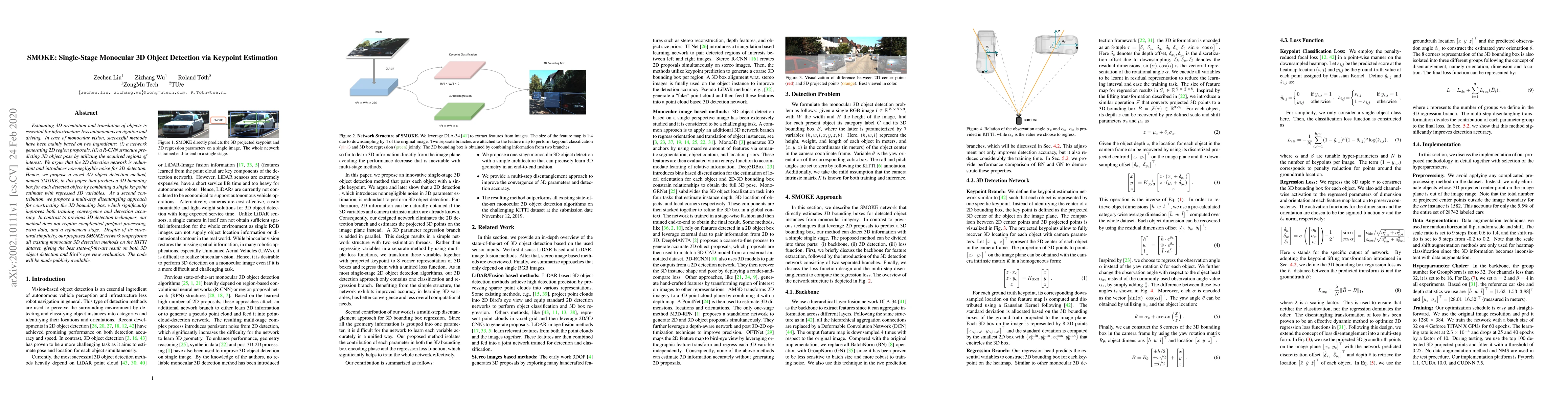 SMOKE proposes a single-stage monocular 3D object detection method that directly estimates 3D bounding boxes using keypoint estimation, eliminating the need for 2D region proposals and R-CNN structures. This method outperforms existing techniques on the KITTI dataset, achieving state-of-the-art results with improved training and detection accuracy.