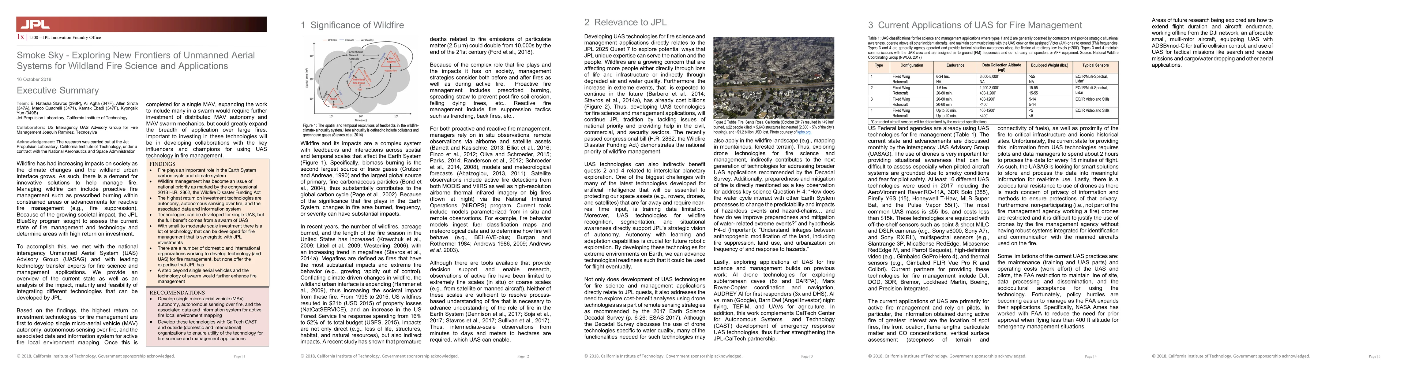 Wildfire has had increasing impacts on society as the climate changes and the wildland urban interface grows. As such, there is a demand for innovative solutions to help manage fire. Managing wildfire can include proactive fire management such as prescribed burning within constrained areas or advancements for reactive fire management (e.g., fire suppression). Because of the growing societal impact, the JPL BlueSky program sought to assess the current state of fire management and technology and determine areas with high return on investment. To accomplish this, we met with the national interagency Unmanned Aerial System (UAS) Advisory Group (UASAG) and with leading technology transfer experts for fire science and management applications. We provide an overview of the current state as well as an analysis of the impact, maturity and feasibility of integrating different technologies that can be developed by JPL. Based on the findings, the highest return on investment technologies for fire management are first to develop single micro-aerial vehicle (MAV) autonomy, autonomous sensing over fire, and the associated data and information system for active fire local environment mapping. Once this is completed for a single MAV, expanding the work to include many in a swarm would require further investment of distributed MAV autonomy and MAV swarm mechanics, but could greatly expand the breadth of application over large fires. Important to investing in these technologies will be in developing collaborations with the key influencers and champions for using UAS technology in fire management.