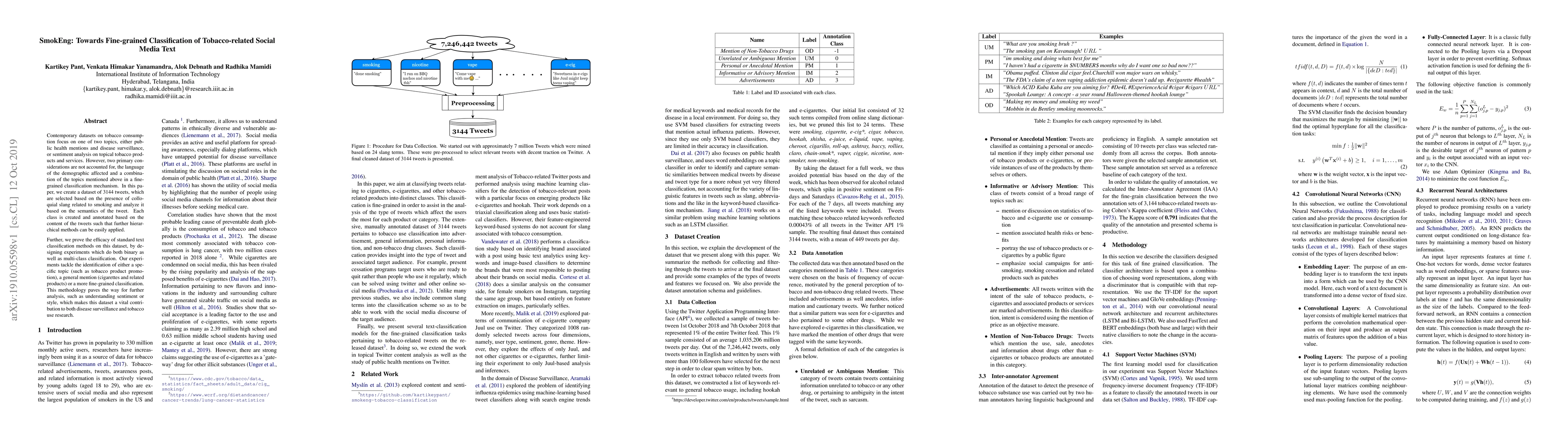 This paper introduces a dataset of 3,144 tweets focused on tobacco-related slang, aiming for fine-grained classification of topics like product promotion and general mentions. The study evaluates the effectiveness of text classification methods for binary and multi-class analysis, contributing valuable insights for disease surveillance and tobacco use research.